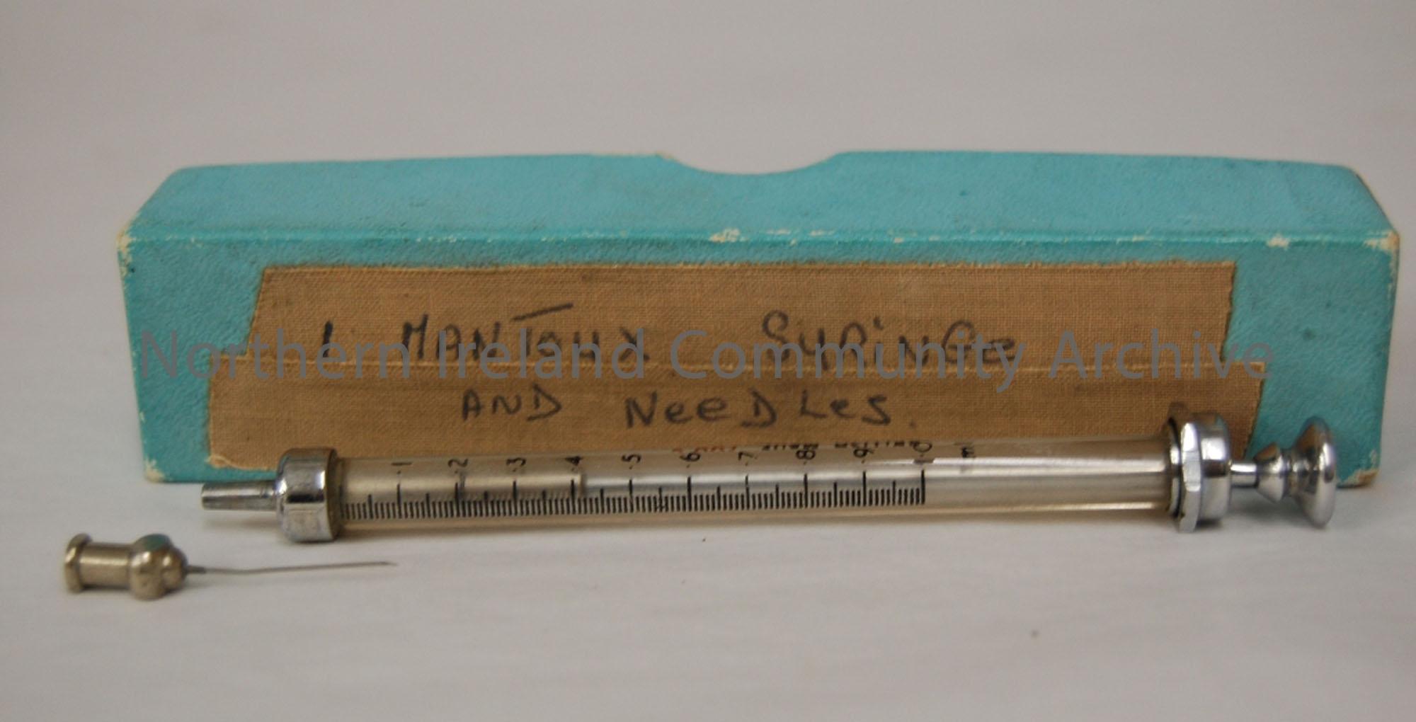 1 Mantaux syringe, 2 needles, glass syringe with metal fixings, light blue box