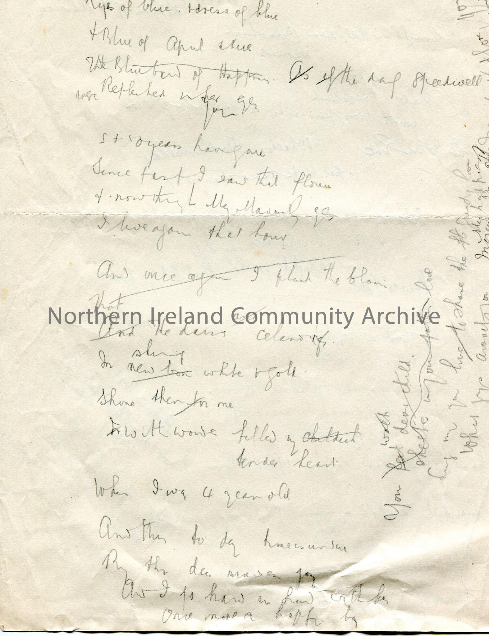 1 of 2 pages of handwritten rough notes and poems or words to songs. First page double sided. – img001b