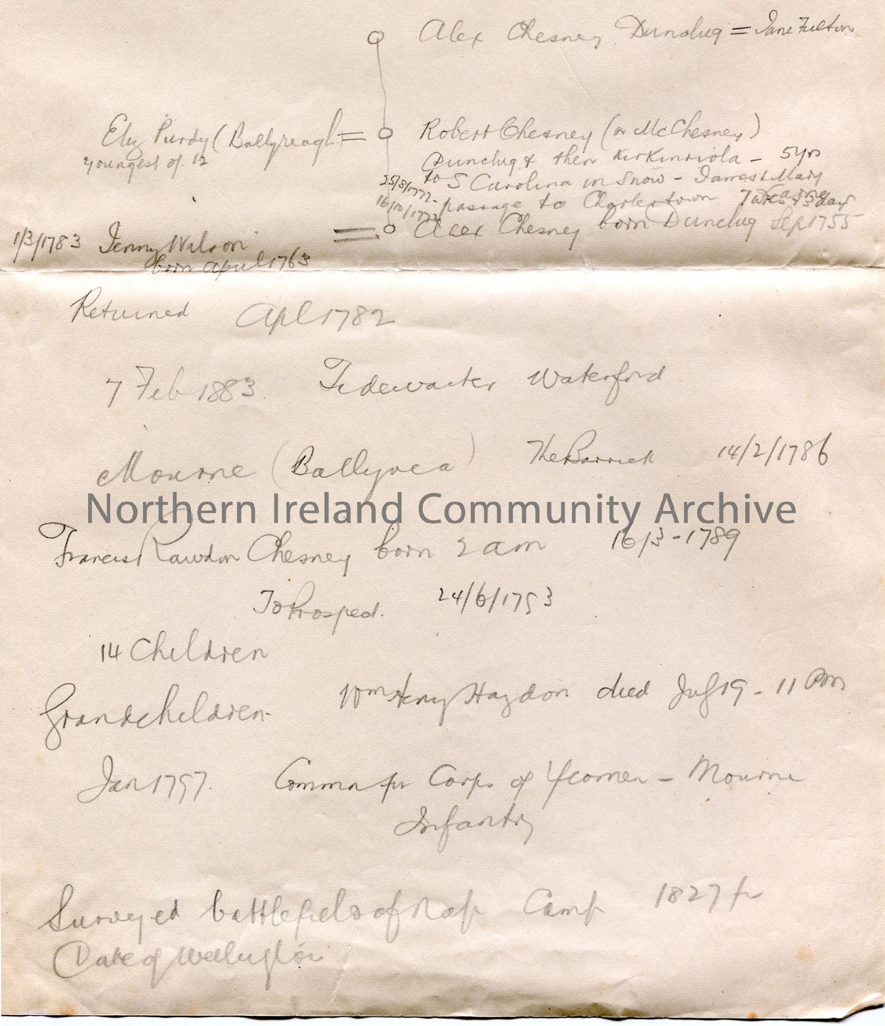 1 of 2 pages of handwritten rough notes re Chesney genealogy. "Chesney" written in green ink on back of second page.