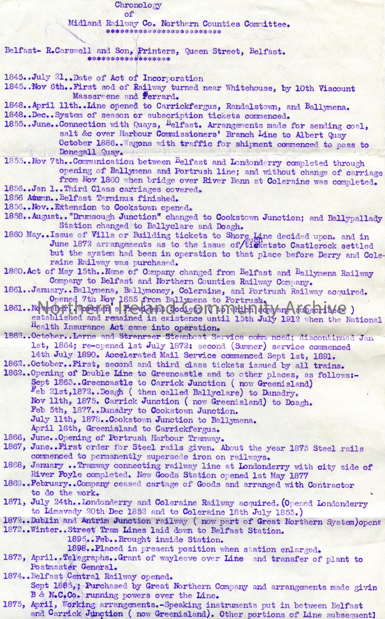1 of 4 pages of typed document titled, 'Chronology of Midland Railway Co. Northern Counties Committee. Belfast- R.Carswell and Son, Printers, Queen Street, Belfast'. Starts 1845 and ends 1917.