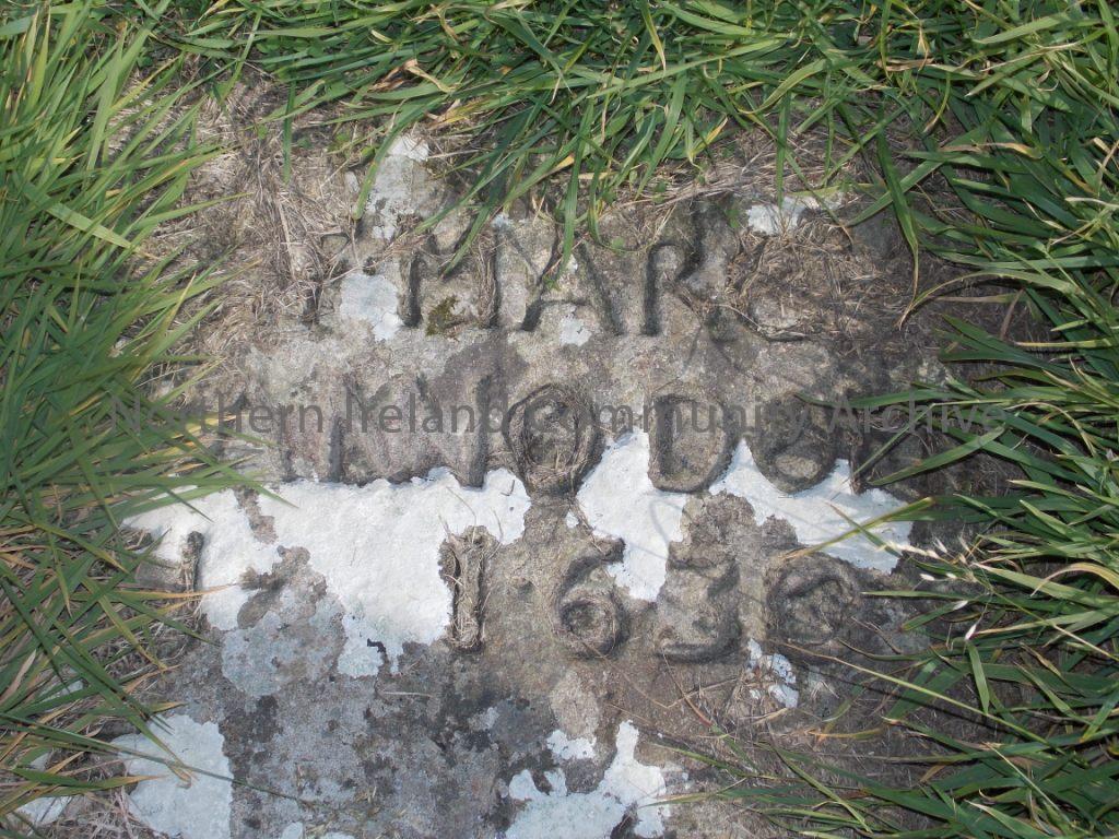 Gravestone set in the ground at St Cuthbert's graveyard opposite Dunluce Castle. It reads "Heir lyeth the children of Walter Ki/d Marchant/ in Dunluce Burges of Irvin He made Th/ is stone the 12 of March in Anno Domn 1630"