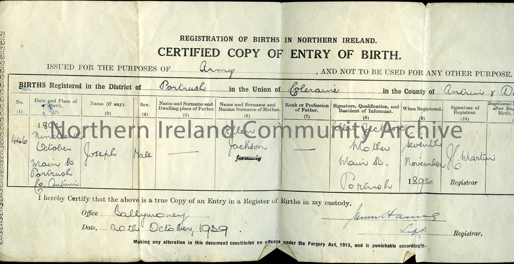 1939 copy of birth certificate for Joseph Jackson. Copy issued for Army purposes.