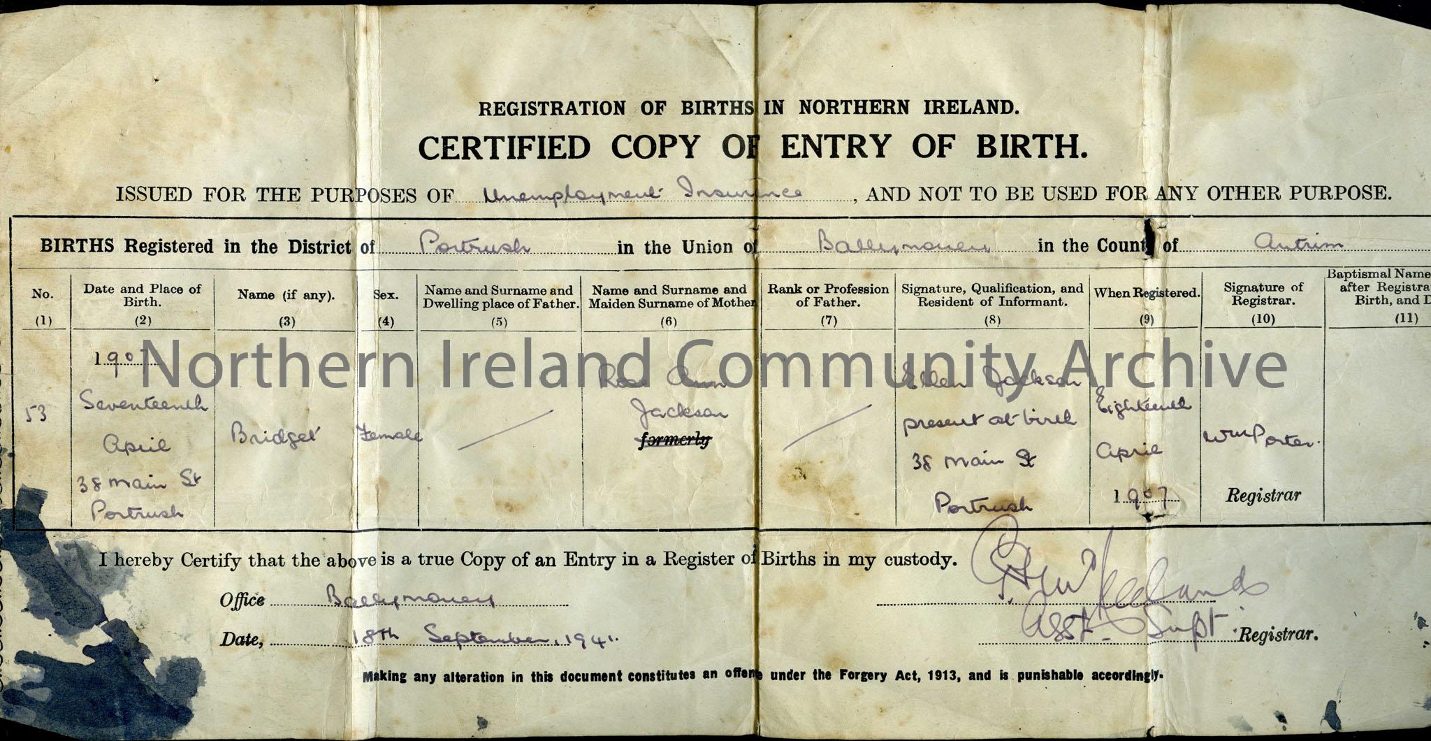 1941 copy of birth certificate for Bridget Jackson. Copy issued for unemployment insurance purposes.
