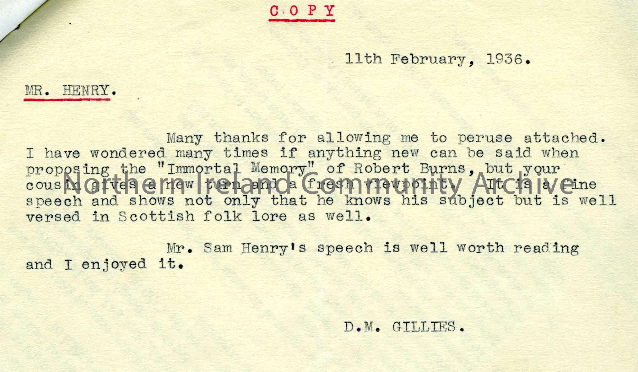 2 letters stapled together. The first is from Sam's cousin Willie, saying that his Immortal Memory speech has been passed on to a Mr Gillies. The second is from Mr Gillies, commending Sam's Immortal Memory speech