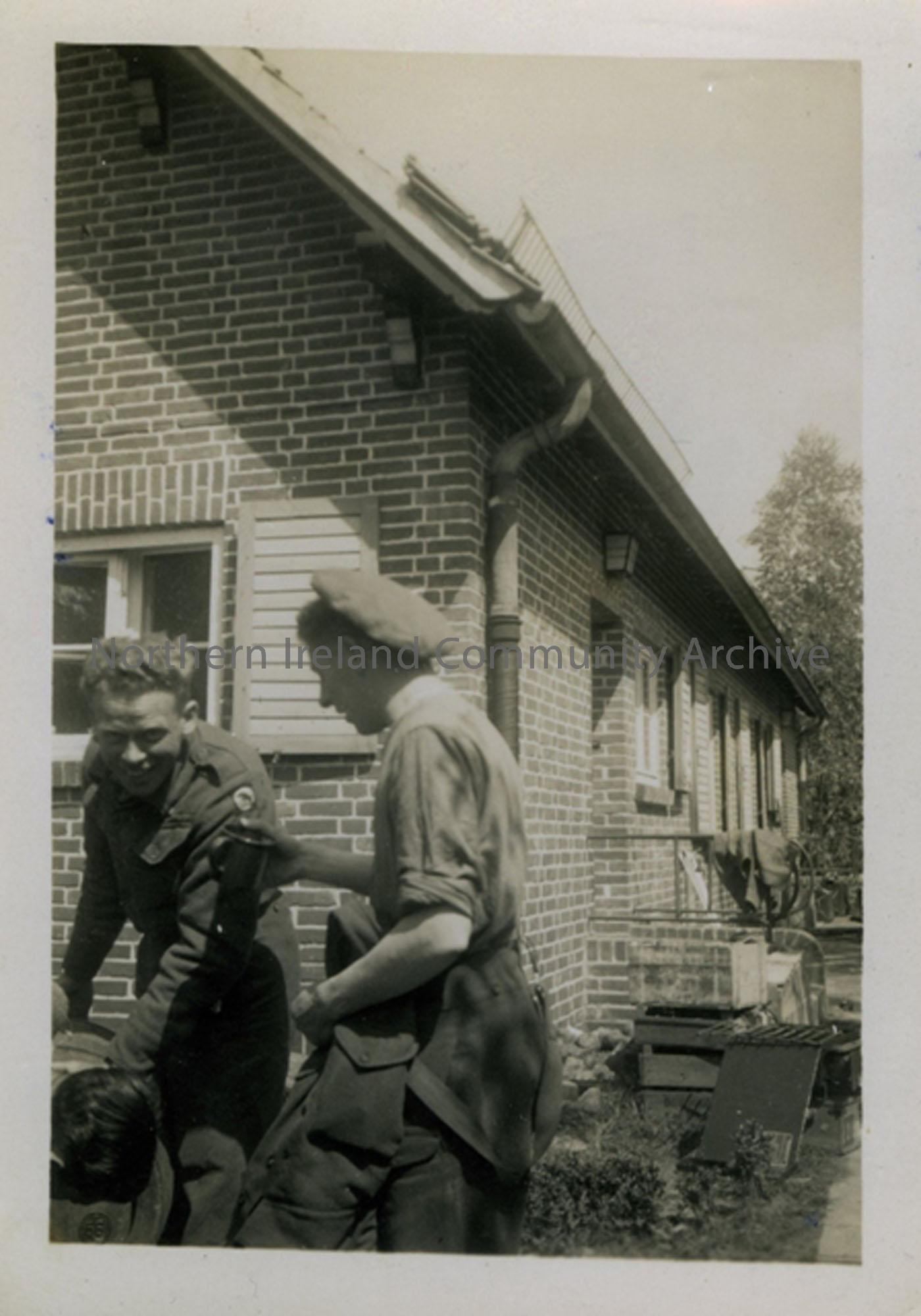 2 soldiers in Damme Germany. Alan Thompson crouched over laughing.