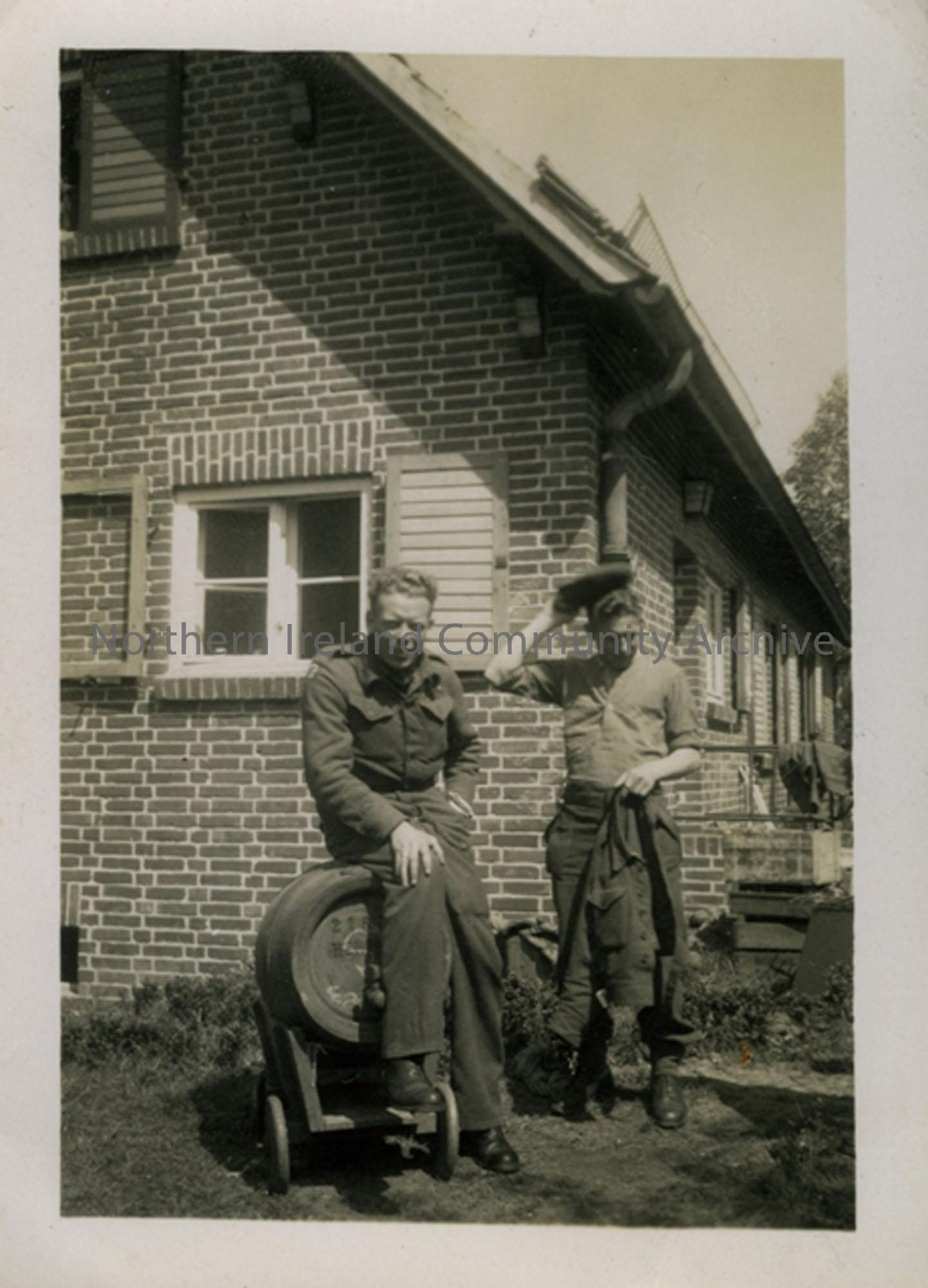 2 soldiers in Damme Germany. Alan Thompson is sitting on the wine barrel.