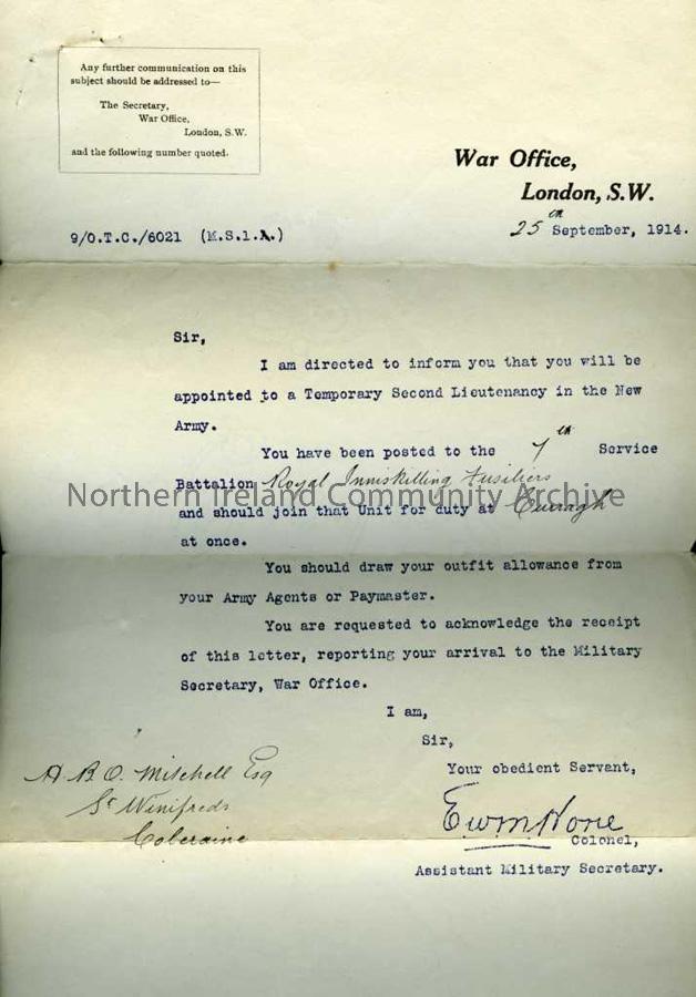 Letter, dating to 25th September 1914, tells him that he has been appointed to Temporary Second Lieutenancy in the New Army and posted to the 7th Battalion Royal Inniskilling Fusiliers.