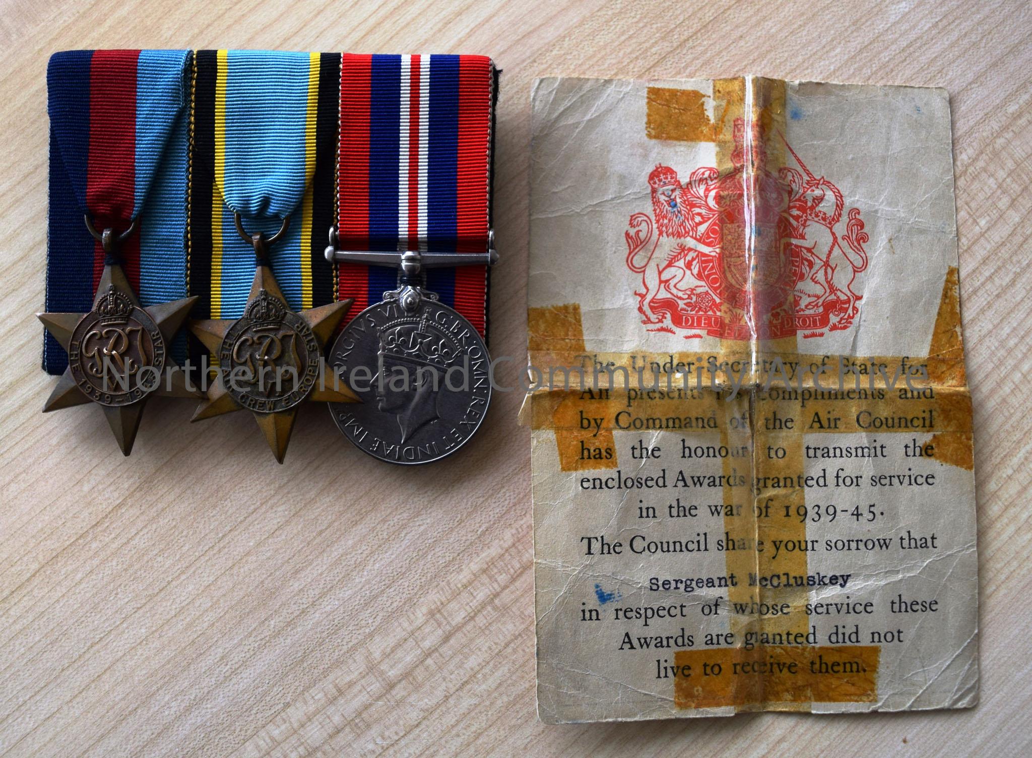 3 medals attached together on a bar with ribbons. Medals are 1939-45 Star with navy blue, red and light blue striped ribbon, Aircrew Europe Star with black, yellow and light blue striped ribbon and war medal with image of George VI on front and red, royal blue and white striped ribbon. Accompanied by white letter to Sergeant McCluskey with red crest at the top and a brown cloth bag with spare ribbons inside.