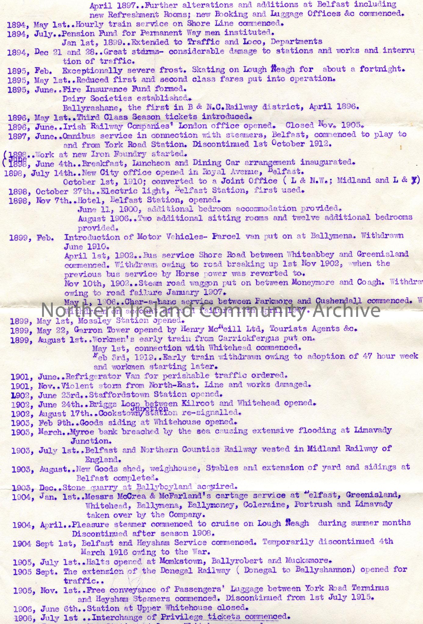 3 of 4 pages of typed document titled, ‘Chronology of Midland Railway Co. Northern Counties Committee. Belfast- R.Carswell and Son, Printers, Queen St…
