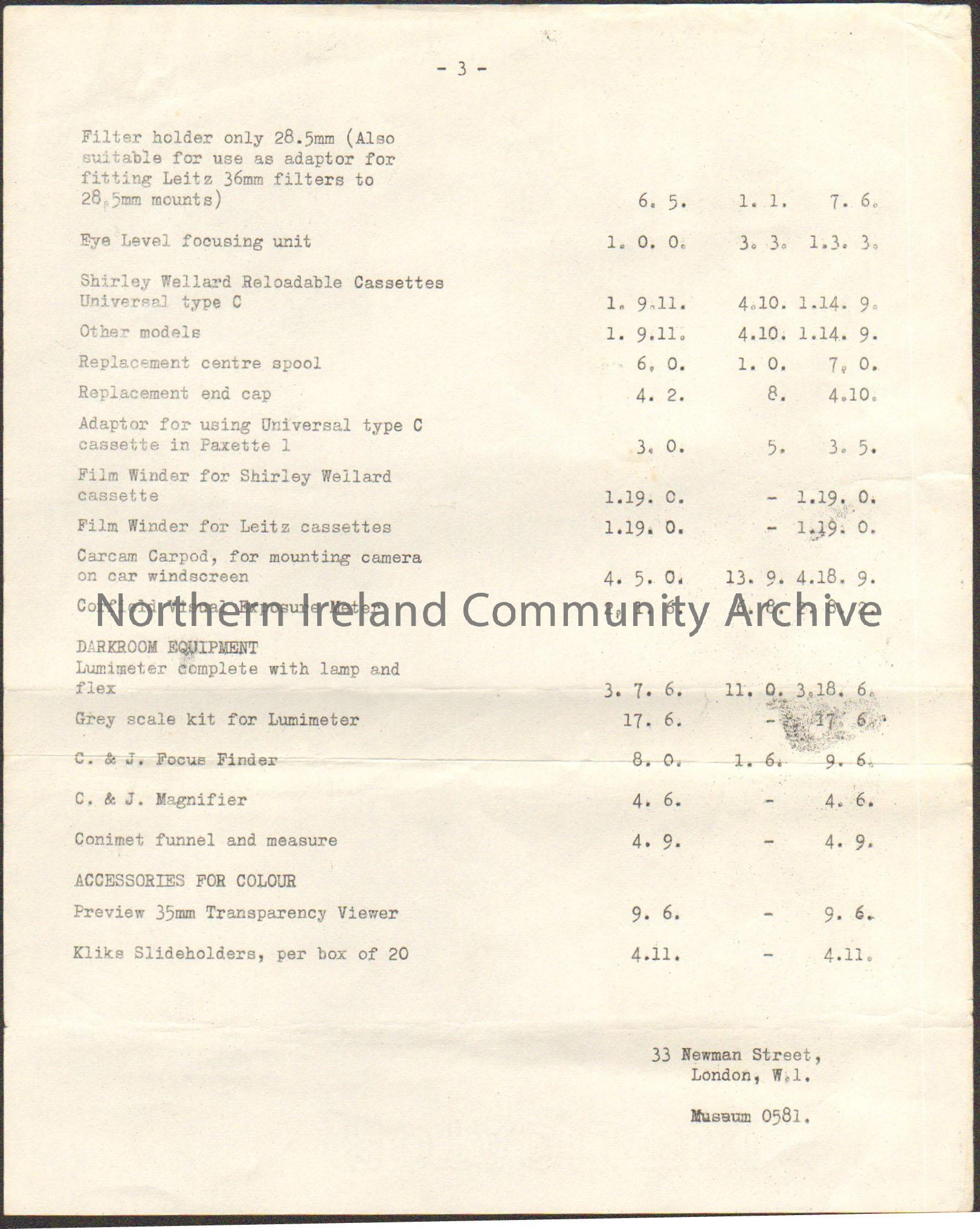 3 pages of price lists for items sold by K. G. Corfield (Sales) Limited. One is a temporary price list (2 pages) and the other for lenses. – 2014.254 (3)
