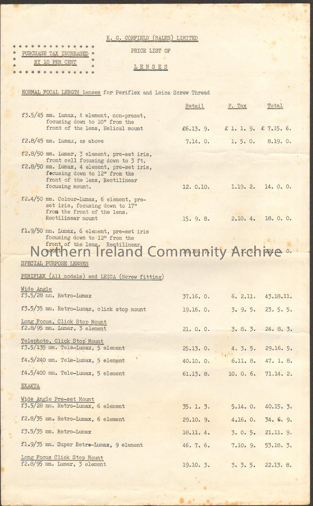 3 pages of price lists for items sold by K. G. Corfield (Sales) Limited. One is a temporary price list (2 pages) and the other for lenses. – 2014.254 (4)