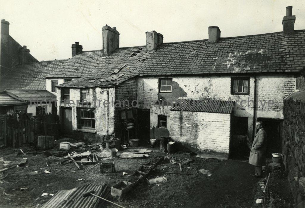 Black and white photograph of 32/38 Long Commons (from rear at an angle), Coleraine, 1957