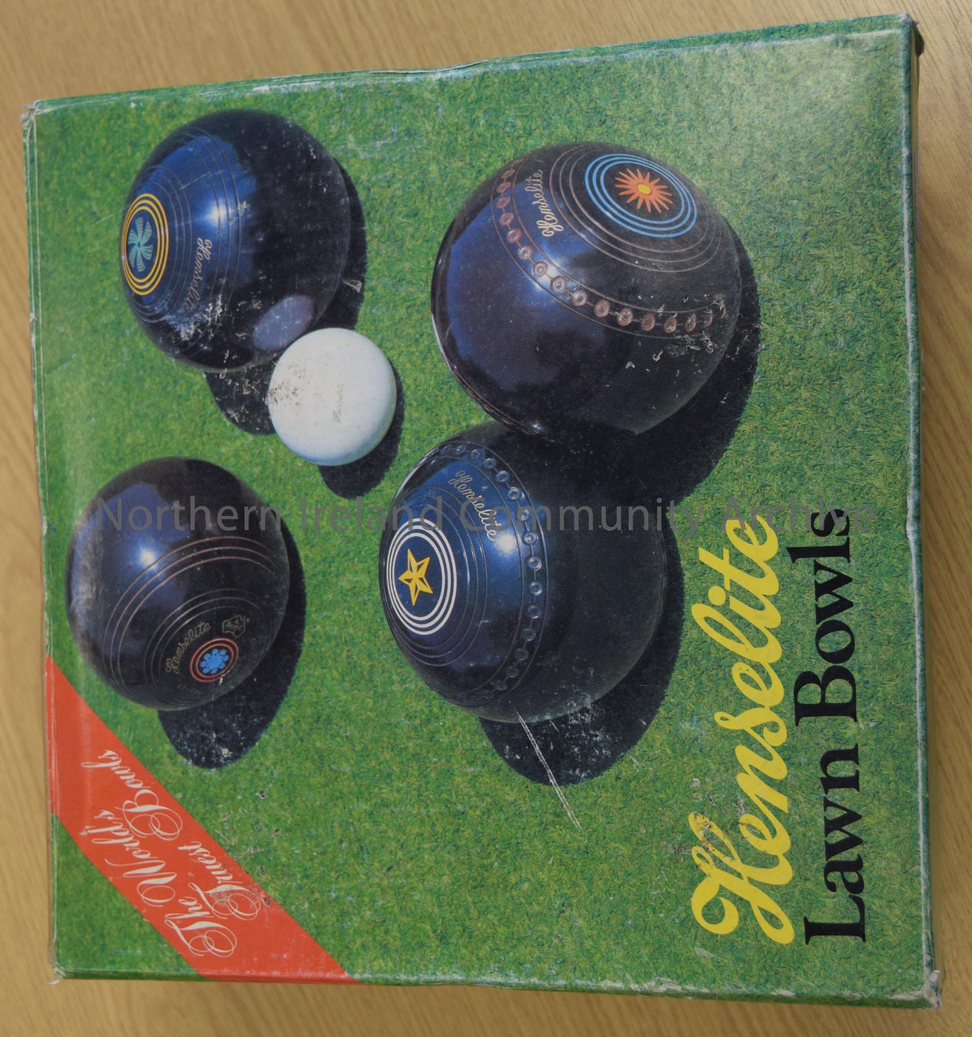 4 black lawn bowls with silver circles on opposite sides in a green box with the picture of some bowls and a jack on grass with the title Henselite La… – 2014.169 (2)