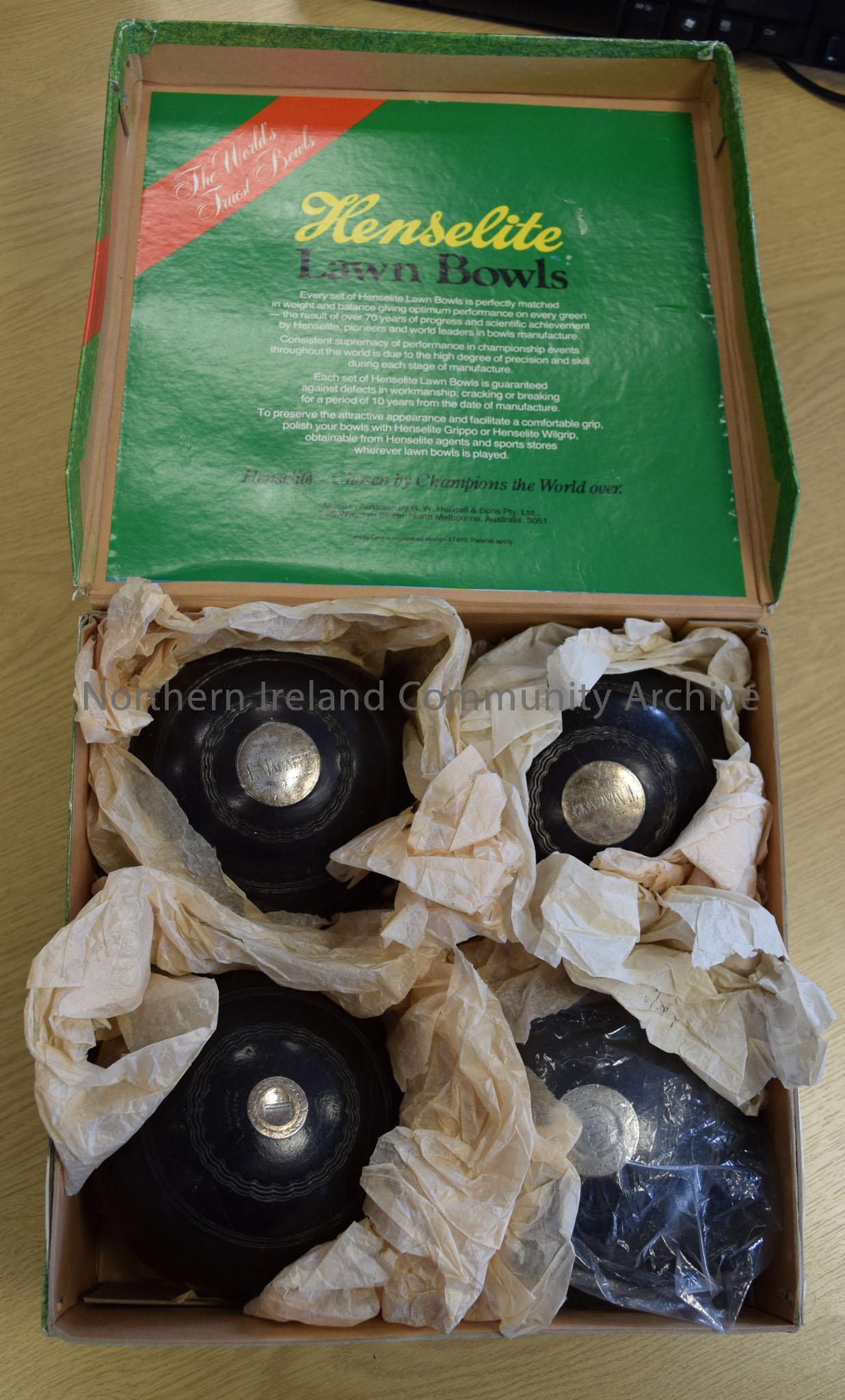 4 black lawn bowls with silver circles on opposite sides in a green box with the picture of some bowls and a jack on grass with the title Henselite La…