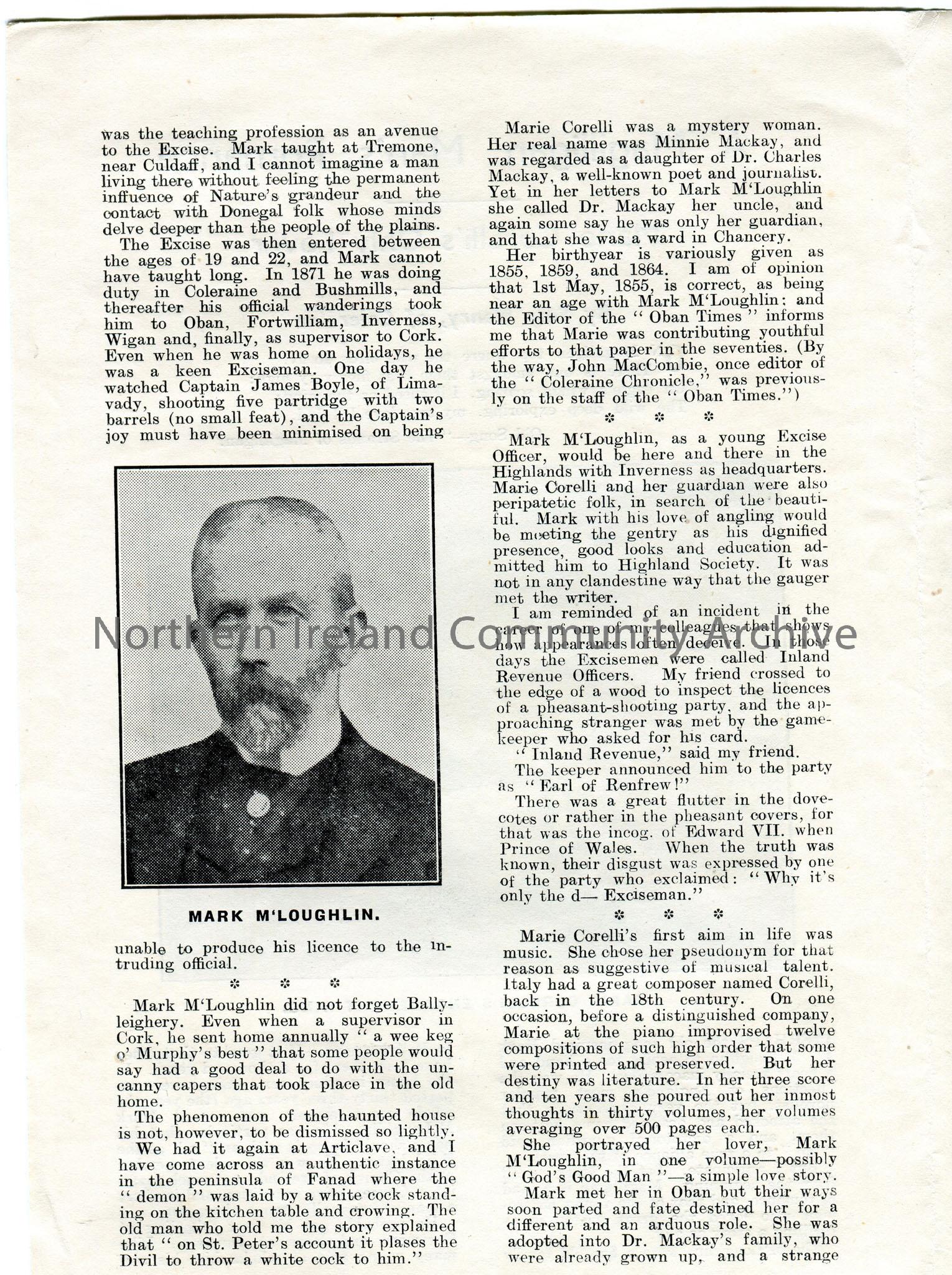 4 sided leaflet titled, 'A Magilligan Man's Romance. Marie Corelli's Only Lover.' By Sam Henry, Coleraine. Verse of 'The Strands of Magilligan' on front cover. One photographic image on each page captioned 'Marie Corelli's Engagement Ring', 'Mark M'Loughlin', 'Mark M'Loughlin's Home at Magilligan' and 'Duncrun Episcopal Church'. Re the engagement of Mark M'Loughlin, Exciseman from Ballyleighery and Marie Corelli.