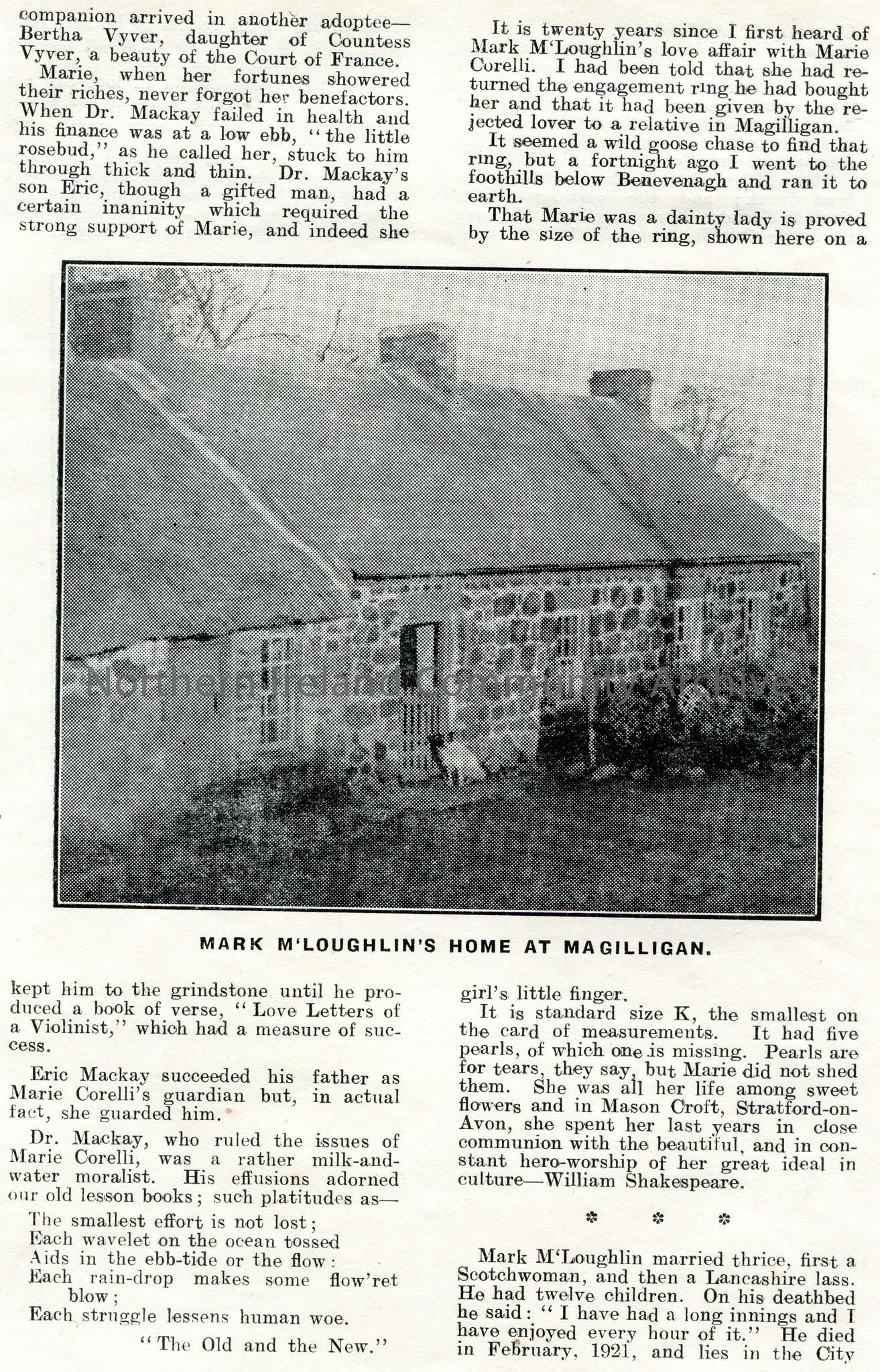 4 sided leaflet titled, 'A Magilligan Man's Romance. Marie Corelli's Only Lover.' By Sam Henry, Coleraine. Verse of 'The Strands of Magilligan' on front cover. One photographic image on each page captioned 'Marie Corelli's Engagement Ring', 'Mark M'Loughlin', 'Mark M'Loughlin's Home at Magilligan' and 'Duncrun Episcopal Church'. Re the engagement of Mark M'Loughlin, Exciseman from Ballyleighery and Marie Corelli.