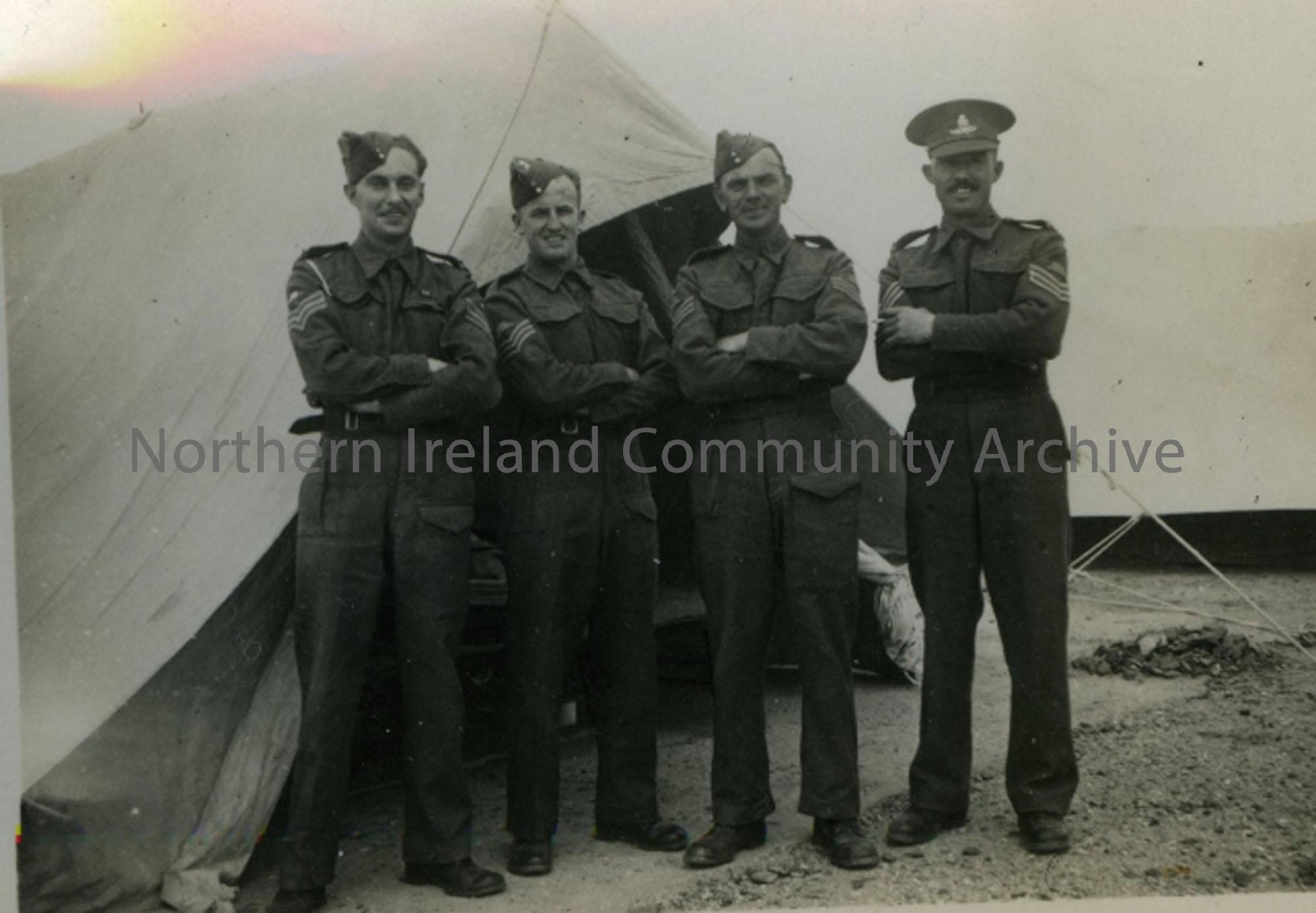 Group of 4 soldiers standing in front of a tent. T McDonald stands 2nd from the left.
