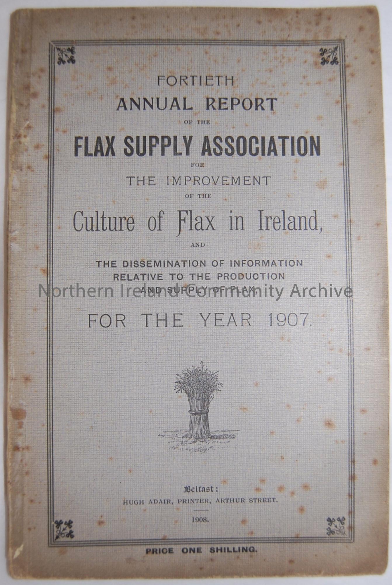 '40th Annual Report of the Flax Supply Association for the Improvement of the Culture of Flax in Ireland...for the year 1907' printed in Belfast by Hugh Adair, Arthur Street, 1908. Blue/green cover. Lists statistics concerning the flax industry in Ireland.