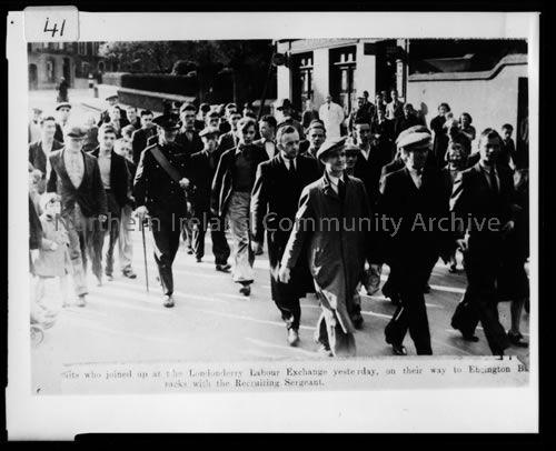 A British Army recruiting sergeant marches new recruits from the Labour Exchange in Bishop Street, Derry, down Abercorn Road towards Ebrington Barracks. (Londonderry Sentinel)