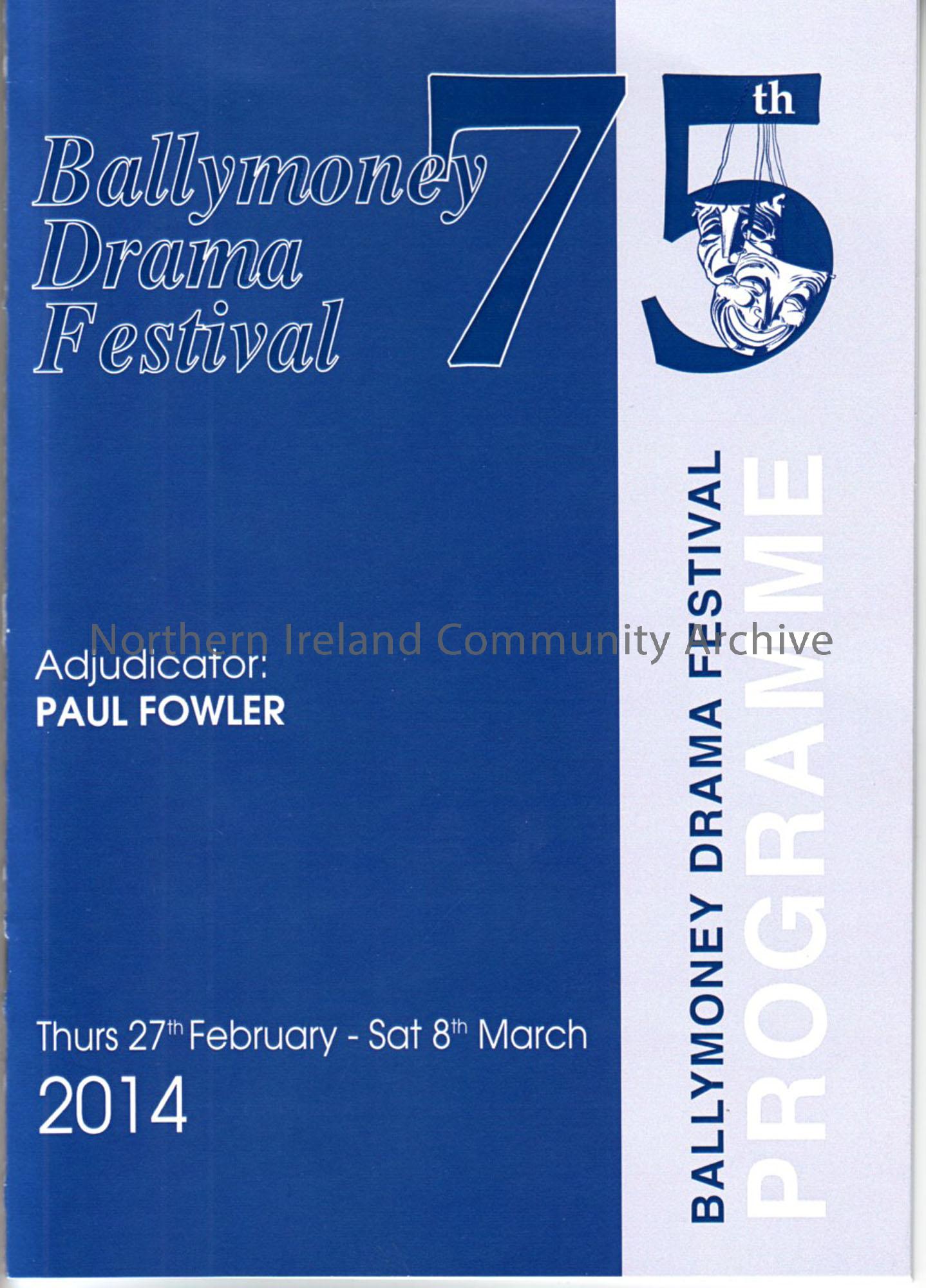 75th Ballymoney Drama Festival programme Thurs 27th February -Sat 8th March 2014. Adjudicator Paul Fowler