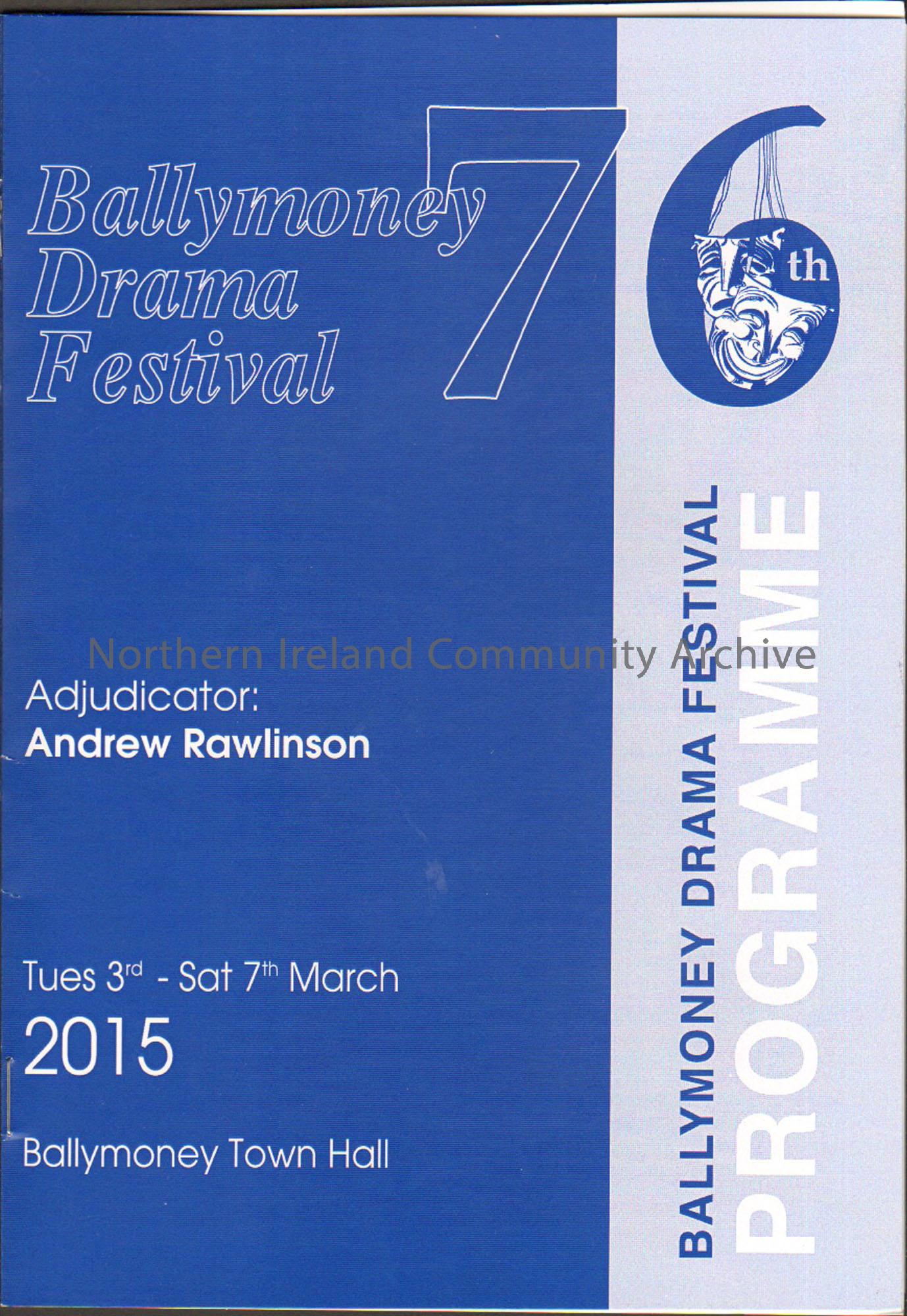 76th Ballymoney Drama Festival programme Tues 3rd March – Sat 7th March 2015. Adjudicator Andrew Rawlinson