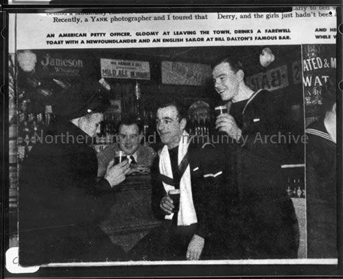 American, English and Newfoundland sailors share a drink in Bill Dalton's Bar, Derry