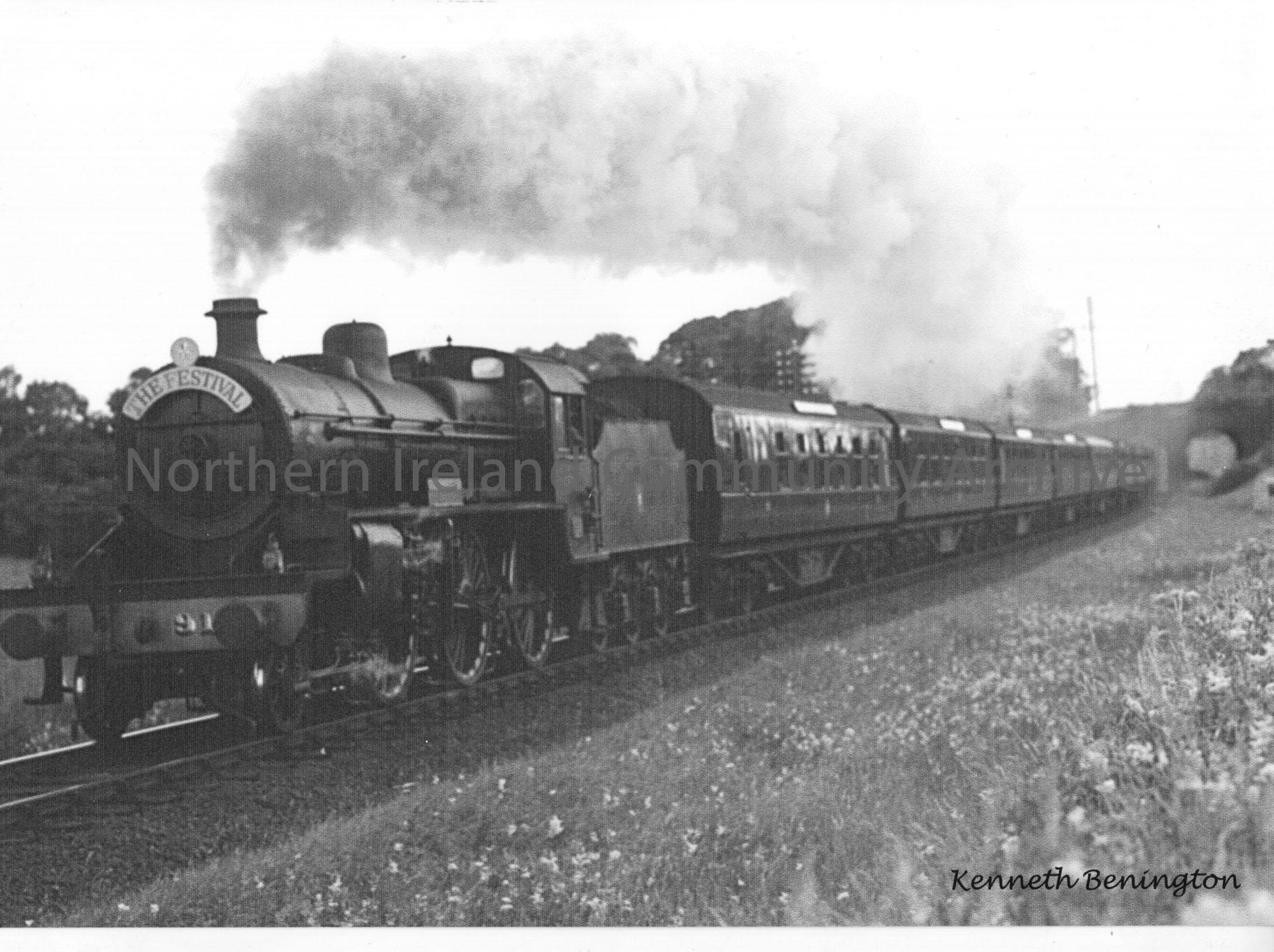 A Belfast-bound Festival tops Ballymoney bank after passing the Dry Arch under the main Ballymoney to Ballymena road at Kilogue. The train is being hauled by W class 2-6-0 No.91 'The Bush'