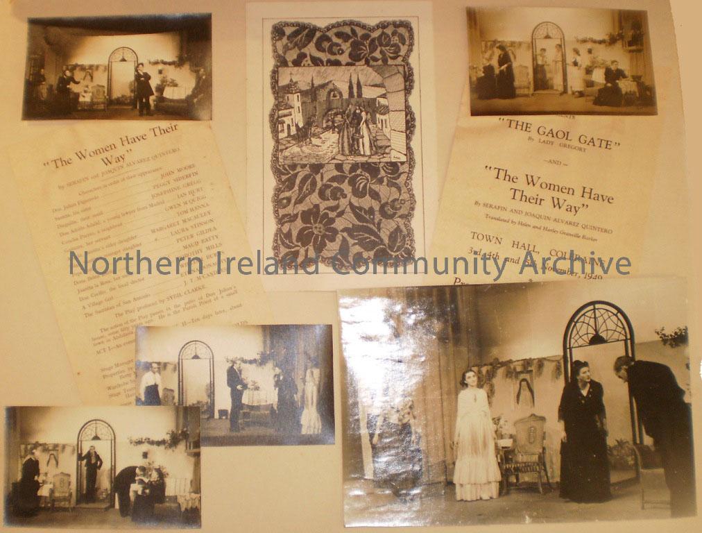 A board displaying five black and white photographs and two programmes which relate to Coleraine Drama Club. The programme reads - Coleraine Drama Club presents 'The Gaol Gate' by Lady Gregory and 'The Women have their Way' by Serafin and Joaquin Alvarez Quintero, translated by Helen and Harley Granville Barker, Town Hall, Coleraine, 3rd, 4th and 5th November, 1949, Programme - sixpence.
