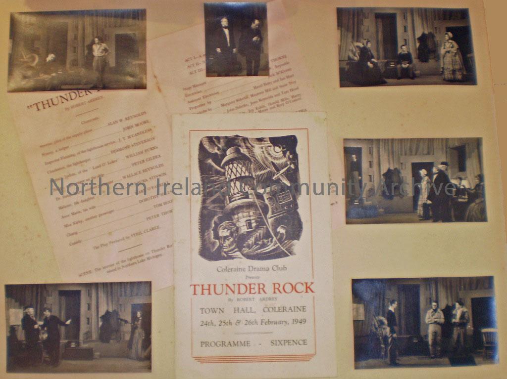 A board displaying six black and white photographs and two programmes which relate to Coleraine Drama Club. The programme reads - Coleraine Drama Club presents 'Thunder Rock' by Robert Ardrey, Town Hall, Coleraine, 24th, 25th and 26th February, 1949, Programme - sixpence.