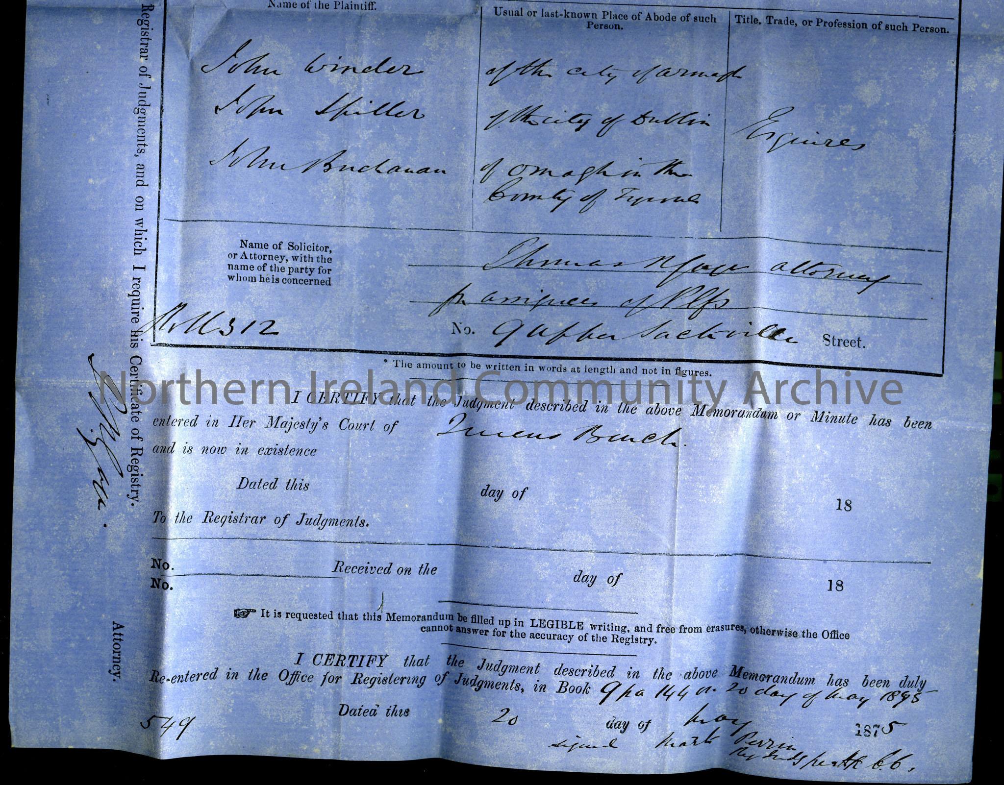 A 'Certificate of Re-Registry of Judgement' re. to a county court judgement in Co. Tyrone from 1824. This certificate is from 1875. Defendant is named as 'Sir John Stewart' from 'Green Hill Co. Tyrone' and the plaintiffs are 'John Winder, John Miller [and] Mrs. Buchanon', all from the Armagh area. This document confirms Stewart owes £5000 debt or damages to the plaintiffs.