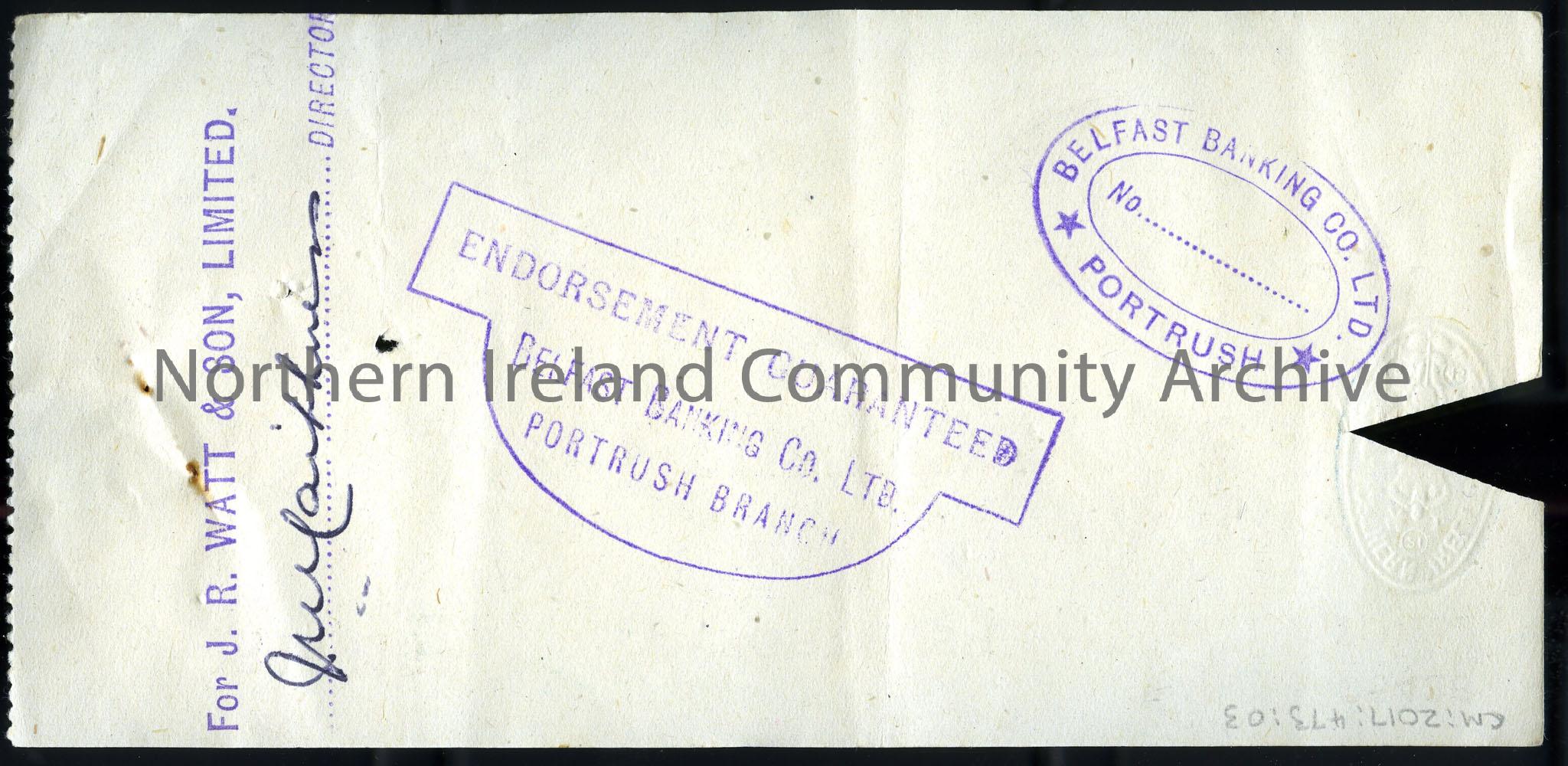 A cheque from ‘Northern Bank Limited’, ‘Portrush’ branch. Cheque no. ‘B14915’. Cheque payable to ‘R. Watt and Sons’ for ‘£2-5-5’. Cheque signed b… – scan447