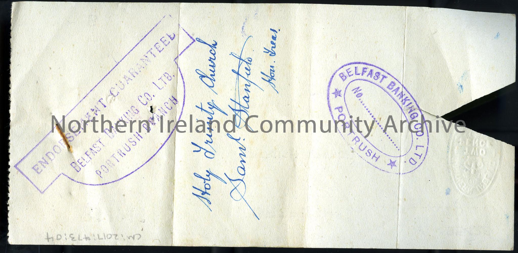 A cheque from ‘Northern Bank Limited’, ‘Portrush’ branch. Cheque no. ‘B14916’. Cheque payable to ‘Hon. Treasurer, Holy Trinity Church, Portrush (Poor … – scan449