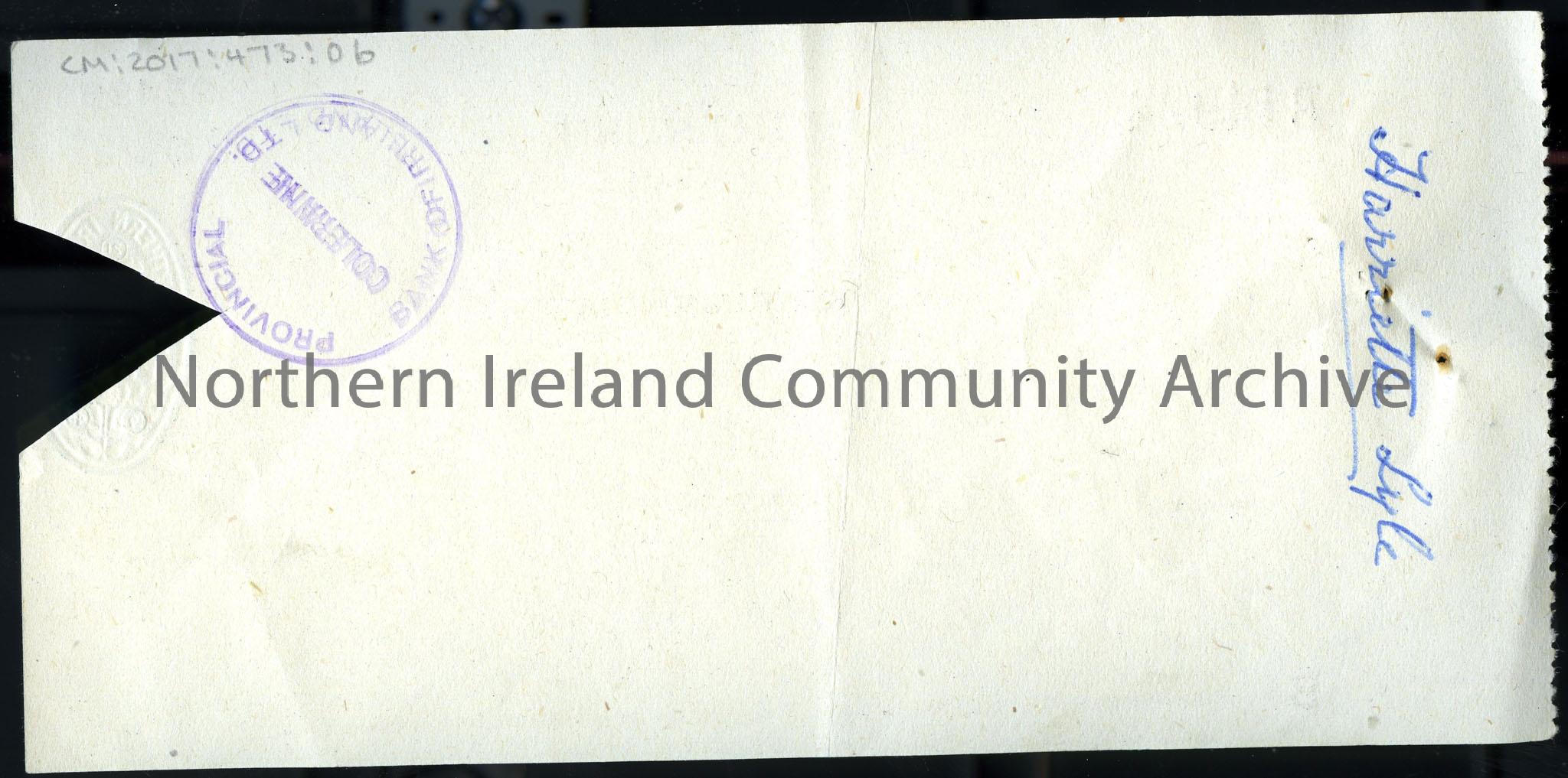 A cheque from ‘Northern Bank Limited’, ‘Portrush’ branch. Cheque no. ‘B14923’. Cheque payable to ‘Miss H. Lyle’ for ‘one pound’. Cheque signed by ‘Emi… – scan455