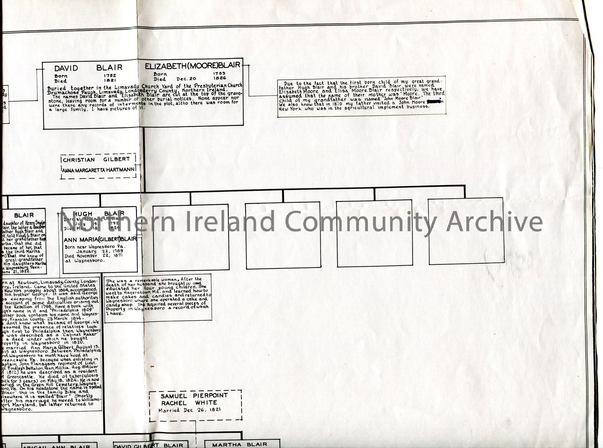 A copy of a family tree of the Blair family. Begins with David Blair b. 1752 of Ballymaglin and his marriage to Elizabeth Moore b. 1753. There are spaces for missing information of family members.