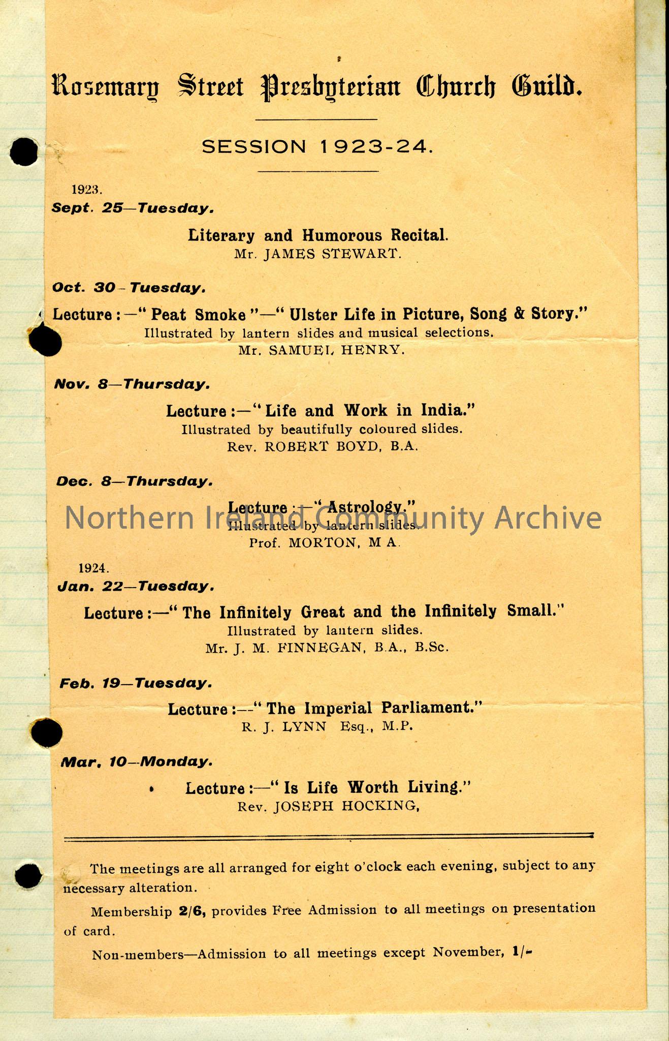 A copy of Rosemary Street Presbyterian Guild's session of talks for 1923-24. They include a talk by Sam Henry entitled "Peat Smoke" - "Ulster Life in Picture, Song and Story."