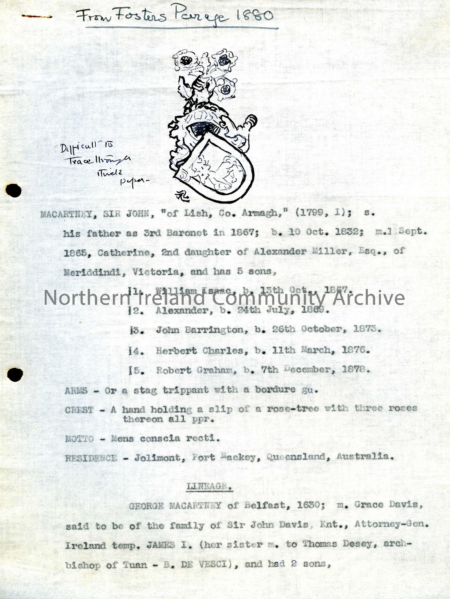 A copy of the family tree of Sir John Macartney taken from "Foster's Peerage" of 1880. It describes the family coat of arms and gives the lineage from George Macartney of Belfast, 1630.