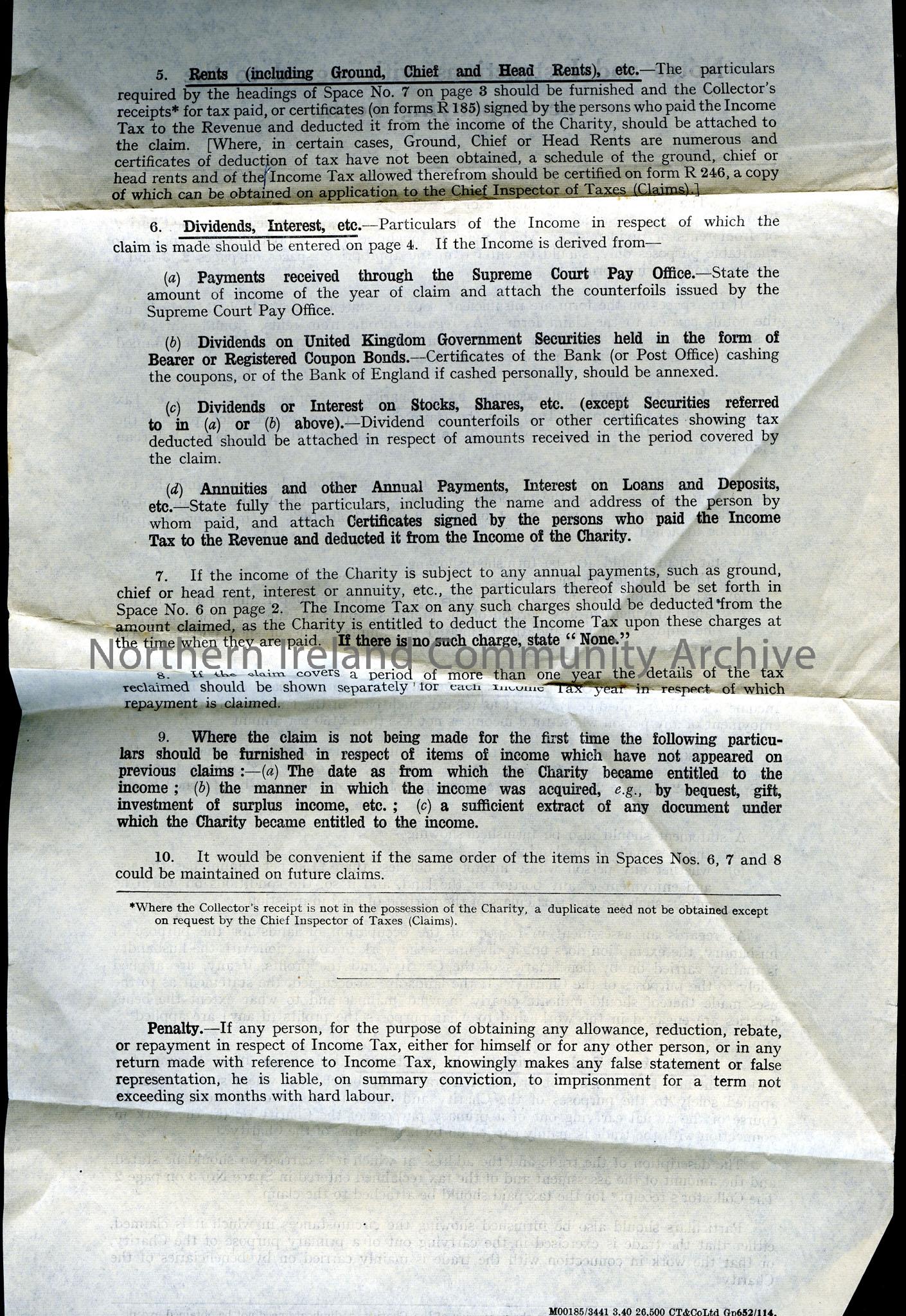 A document entitled 'Notes and Instructions with regard to the accompanying Form'. Document offers guidance for the completion of form regarding tax details for charitable institutions eg. tax stipulations for properties owned and/or occupied by a charity etc. Likely dating from 1945 (see CM:2017:474.1).