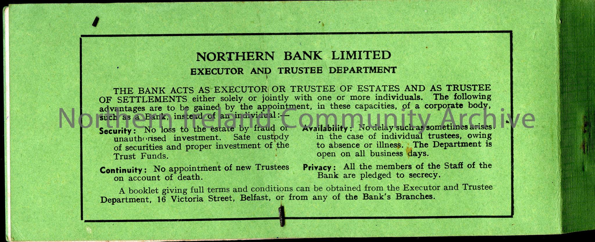 A green chequebook from ‘Northern Bank Ltd’, ‘Portrush’. Chequebook no. ‘77426’. On front in pen, ‘No.3 Rice Bequest’. Inside only cheque stubs remain… – scan437