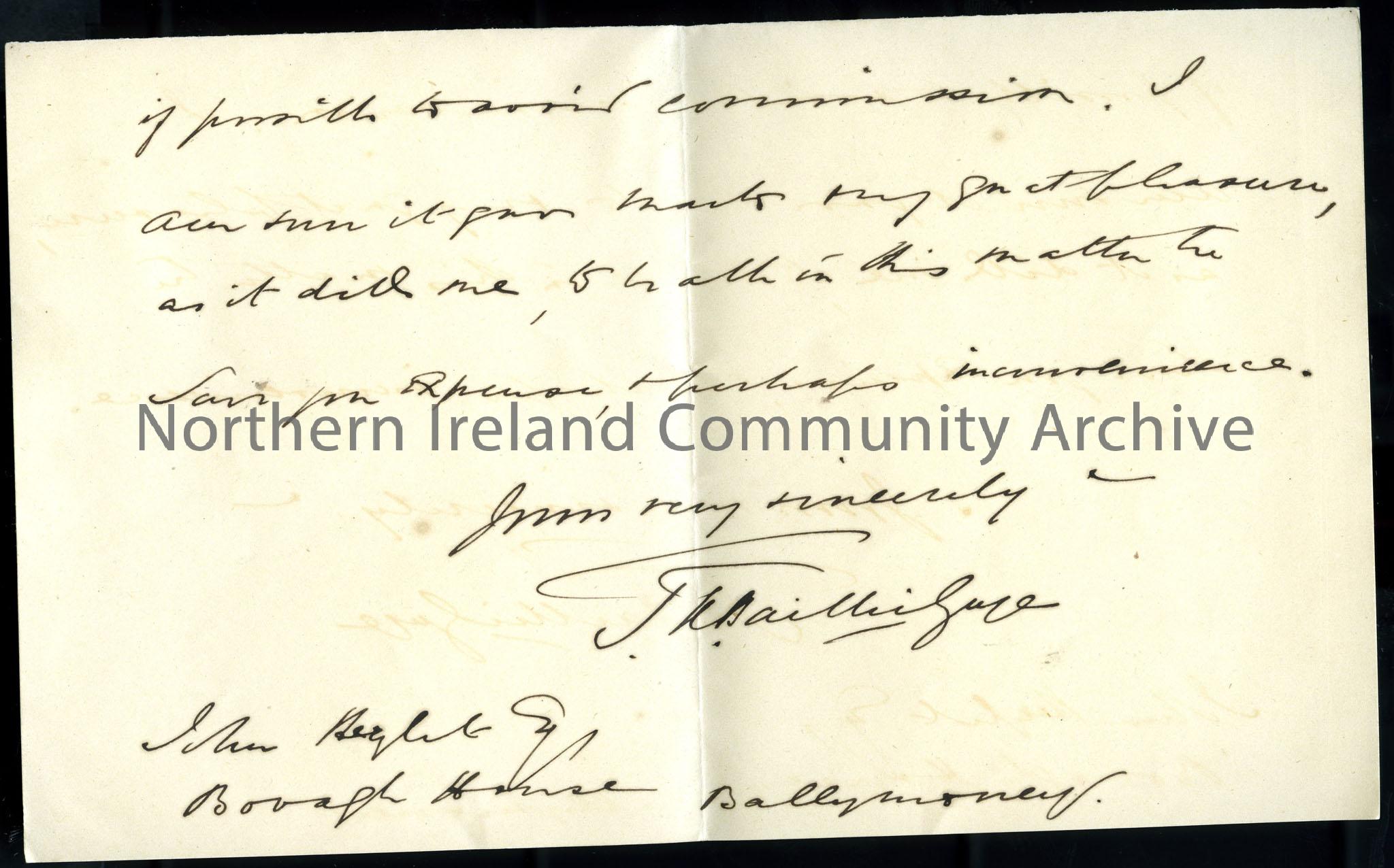 A handwritten letter to ‘John Hezlett Esq., Bovagh House, Ballymoney’ from ‘J. Maillingage(?)’ . Letter discusses how Maillingaze(?) has secured a sum… – scan470b