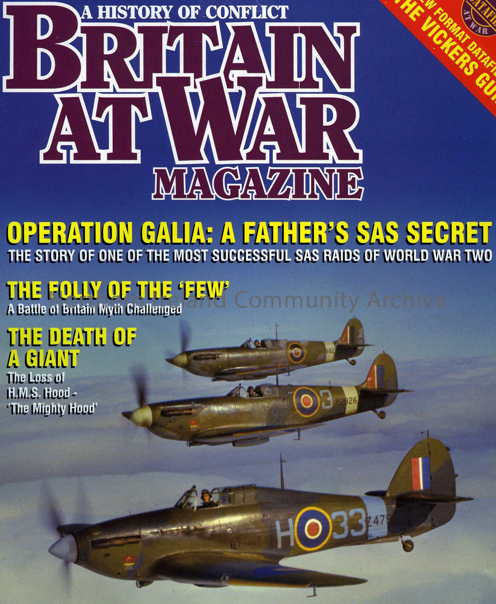 magazine titled, A History Of Conflict Britain At War Magazine. With articles titled, Operation Galia, A Father's SAS secret. The Folly Of The 'Few', The Death Of A Giant.