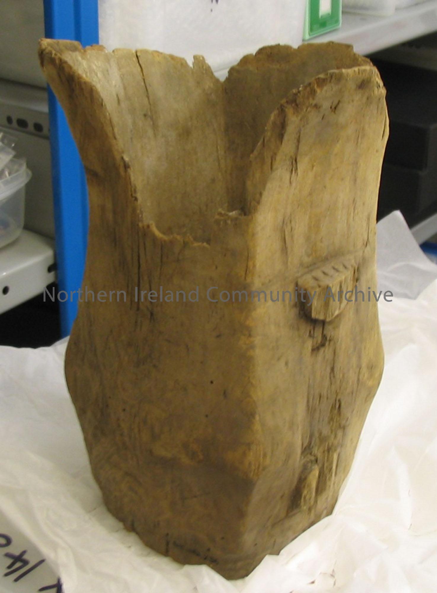 A large amount of the meddar is missing including the handle,bottom and rim missing.