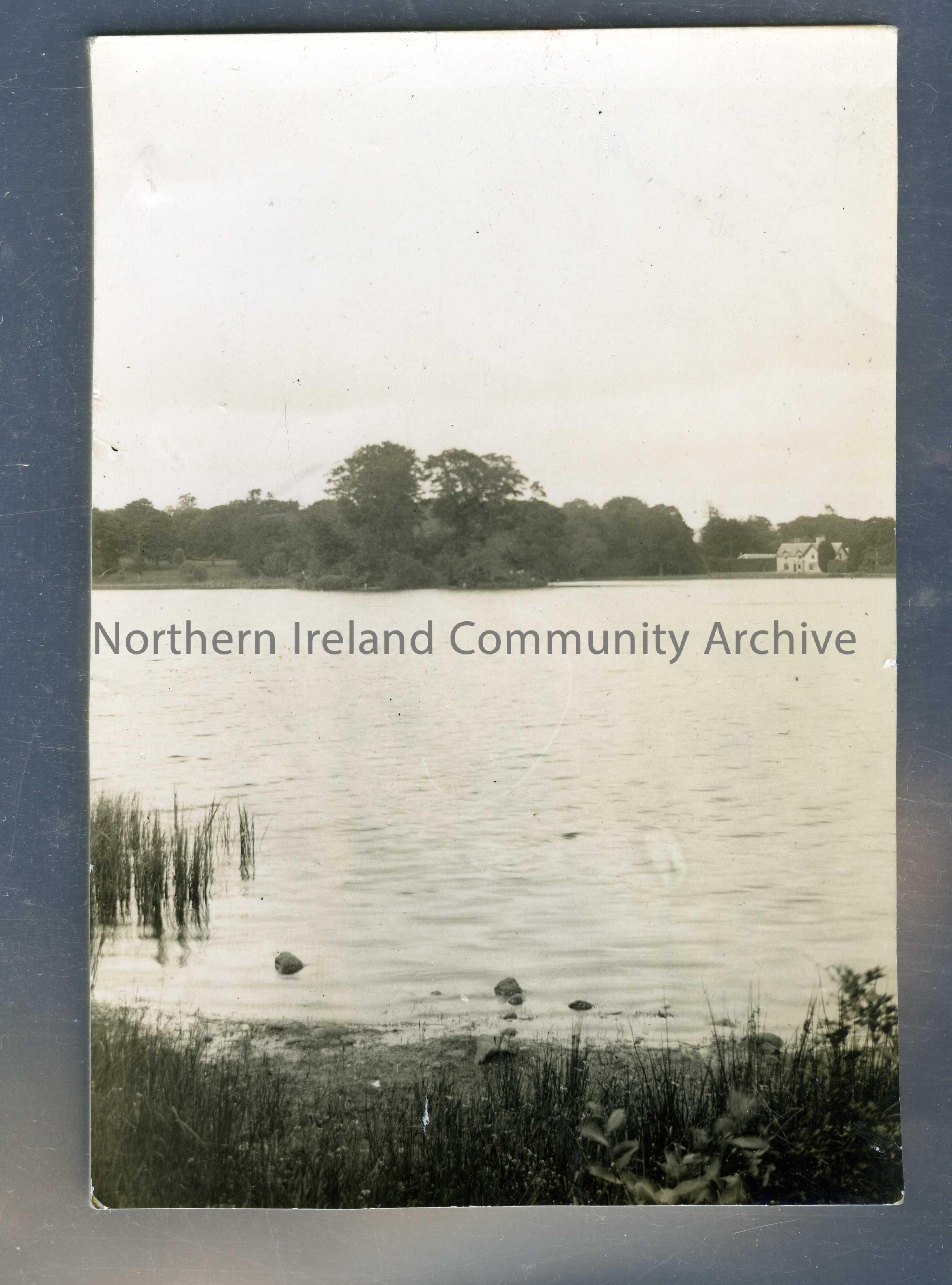 A large lake with a house in the distance.
