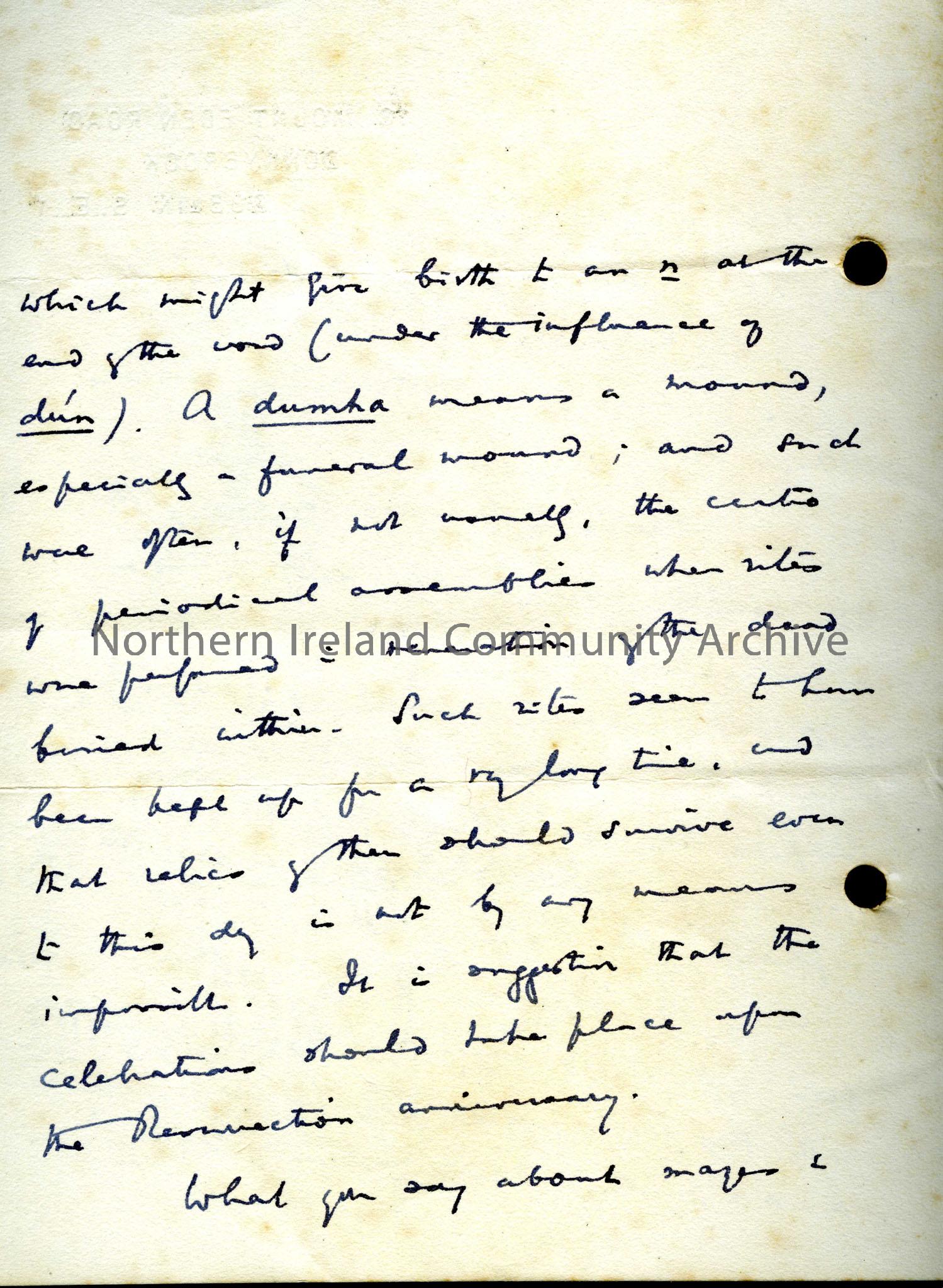 A letter dealing with the meaning of place names in Irish, particularly the word “Dooan”, which the writer suggests may come from the Irish word “dumh… – Scan867