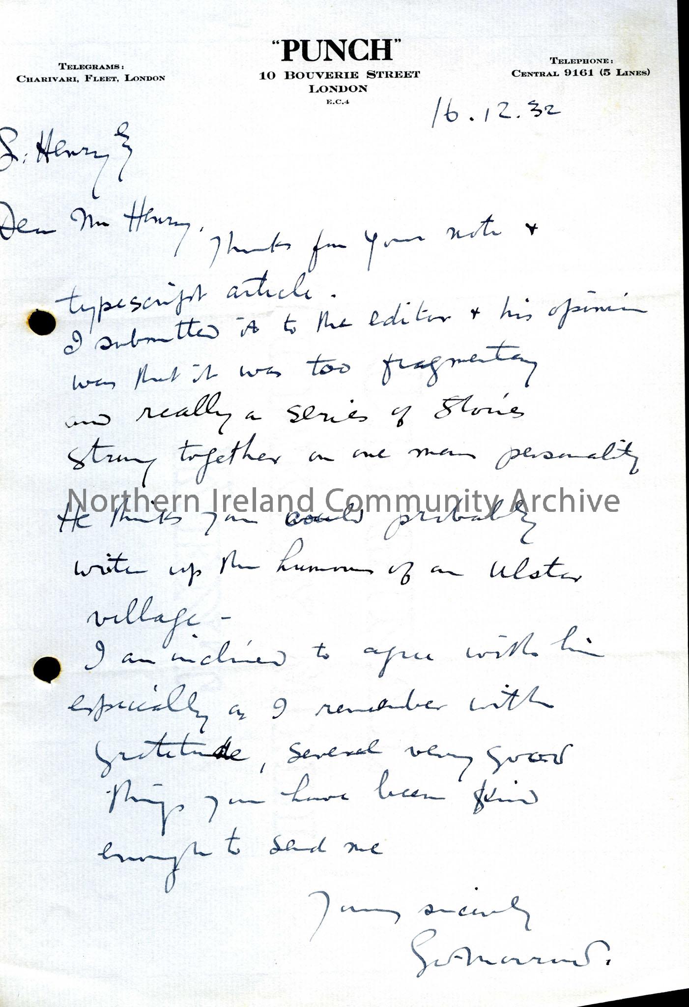 A letter from George Morrow at “Punch” thanking Sam Henry for an article submitted that has been rejected by the editor as being too fragmentary.