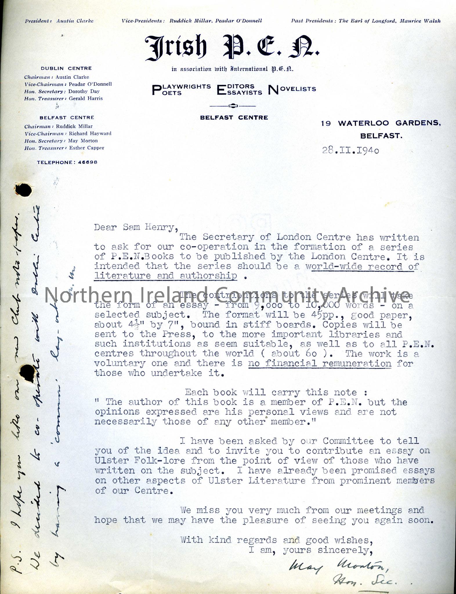 A letter from Irish P.E.N. inviting Sam Henry to contribute an article on Ulster Folk-lore to a world-wide record of literature and authorship being published by the London centre of P.E.N.