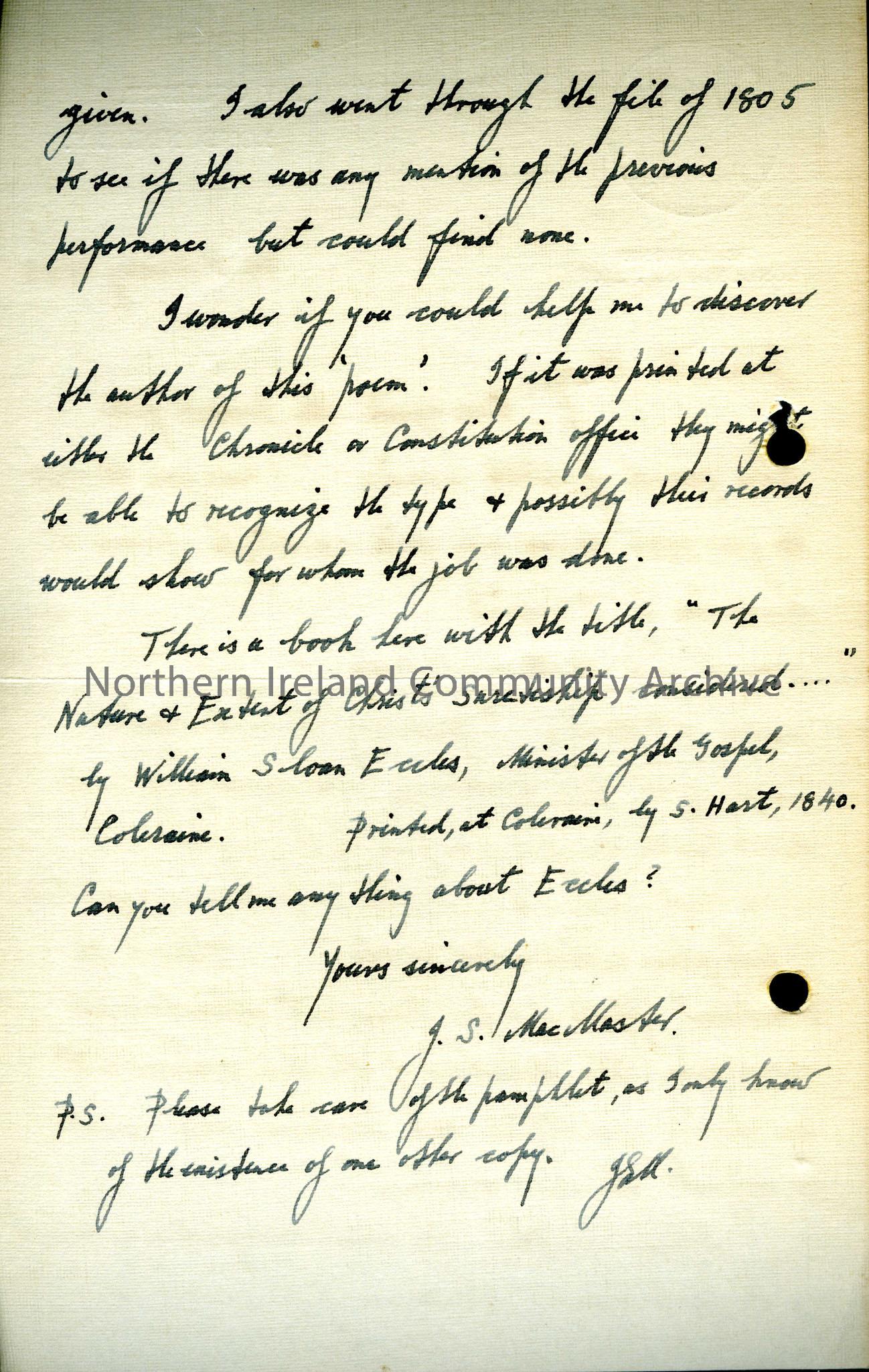 A letter in response to an enquiry Sam has made about newspaper references to theatricals in Coleraine in 1806. The writer has gone through the year and only found one reference on 18th March, 1806 to a performance of "Poor Gentlemen", given to raise money for the support of the aged and infirm. The writer asks if Sam can tell him anything about William Sloan Eccles, Minister of the Gospel, Coleraine.