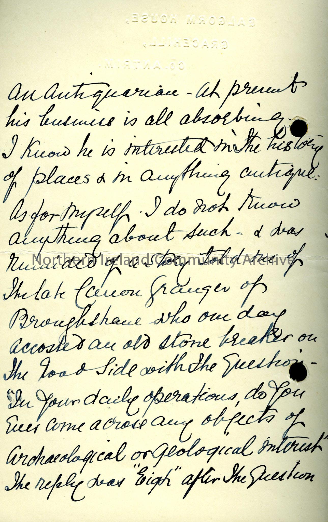 A letter thanking Sam Henry for his. The writer mentions antiquarians from the Ballymena area that she has known: Canon Granger of Broughshane, George… – Scan893