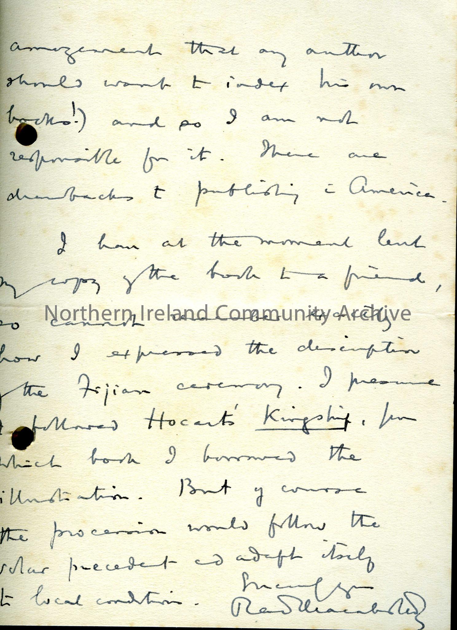 A letter that mentions the writer’s book, “Tara”. It alludes to St. Patrick and kingship ceremonies. The address has been torn off but it is from th…