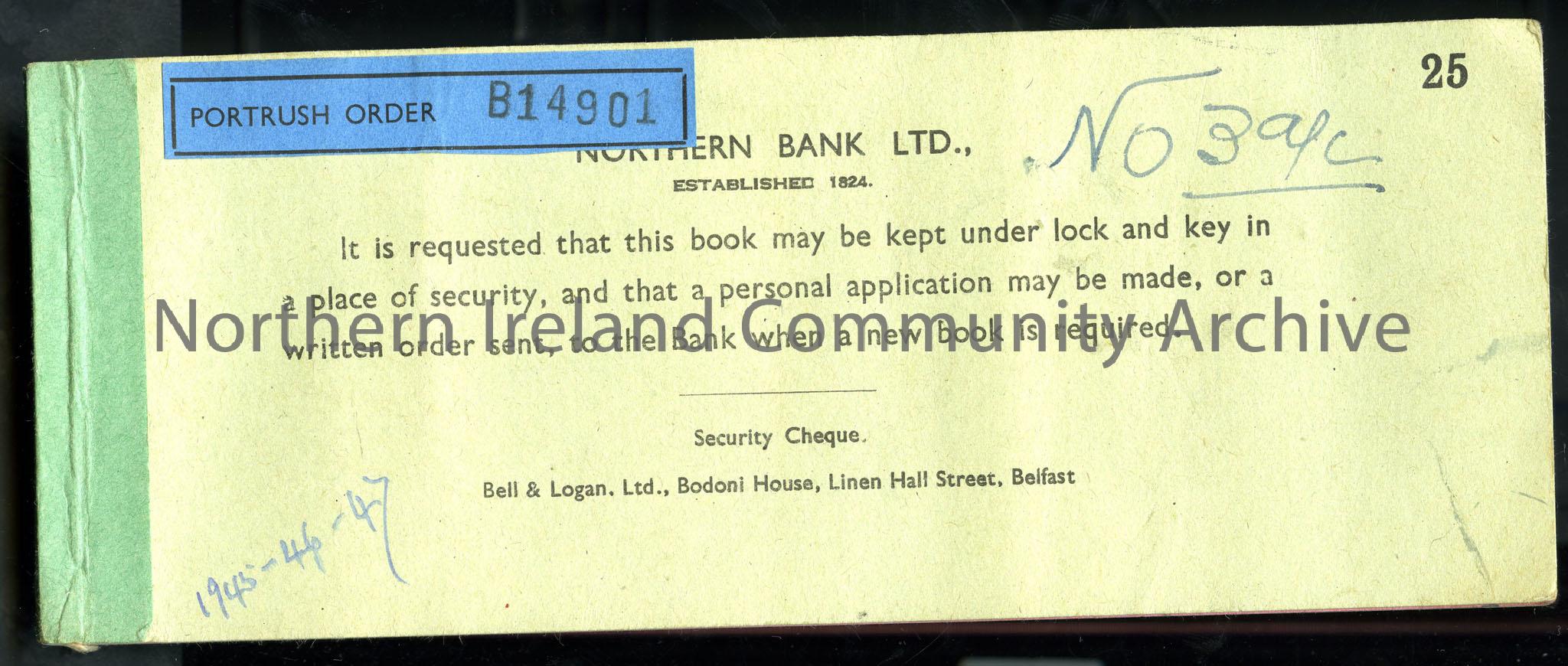 A light green chequebook from ‘Northern Bank Ltd’, ‘Portrush’. Chequebook no. ‘B14901’. On front in pen, ‘No.3 a/c…..1945-46-47’. Inside only cheque…