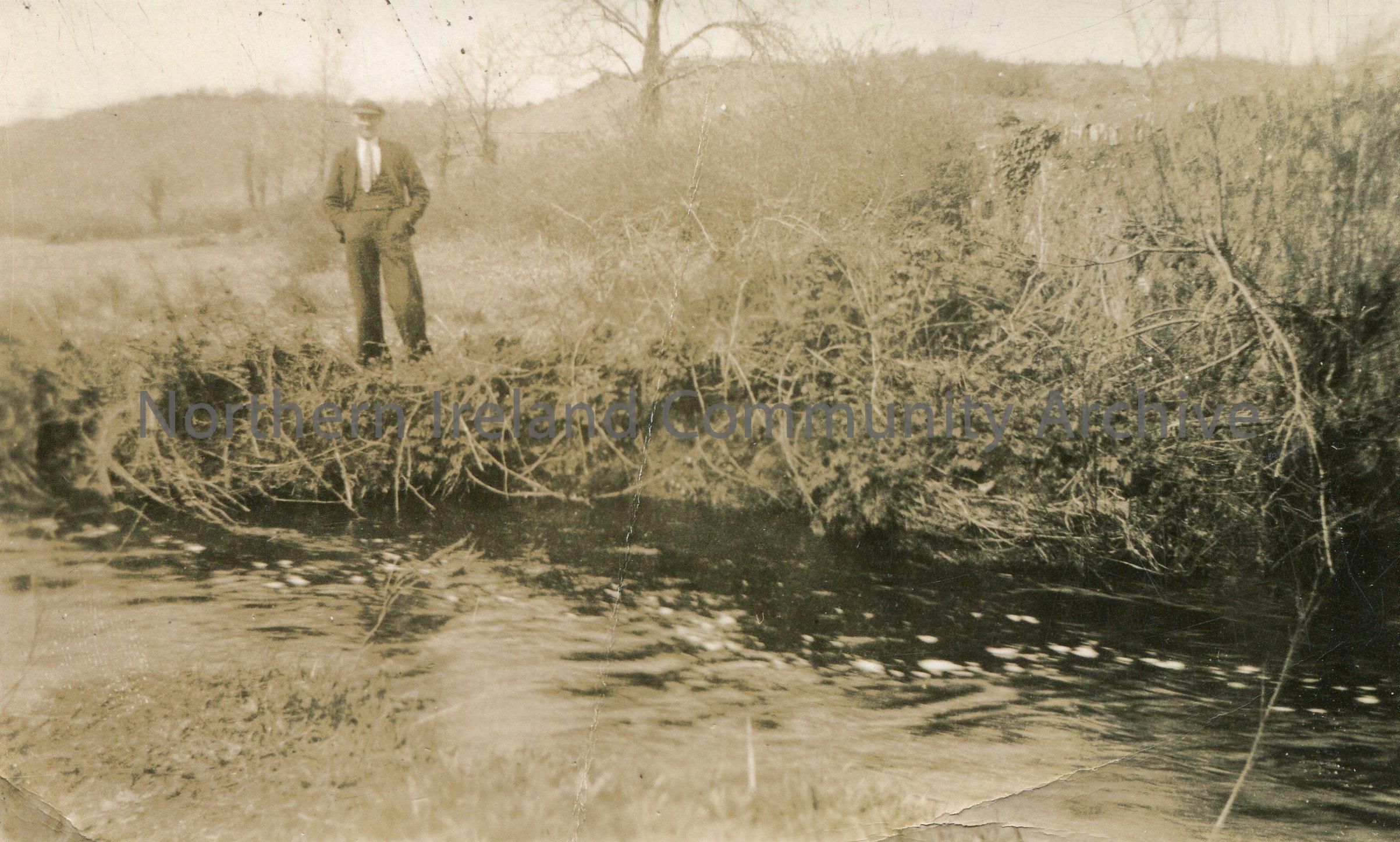 A man standing at the side of a river. Handwritten on reverse, ‘River. Carlton. Jumped. Killyfaddy. A[?], Clogher, Tyrone. April 1935. [?].B.J’.